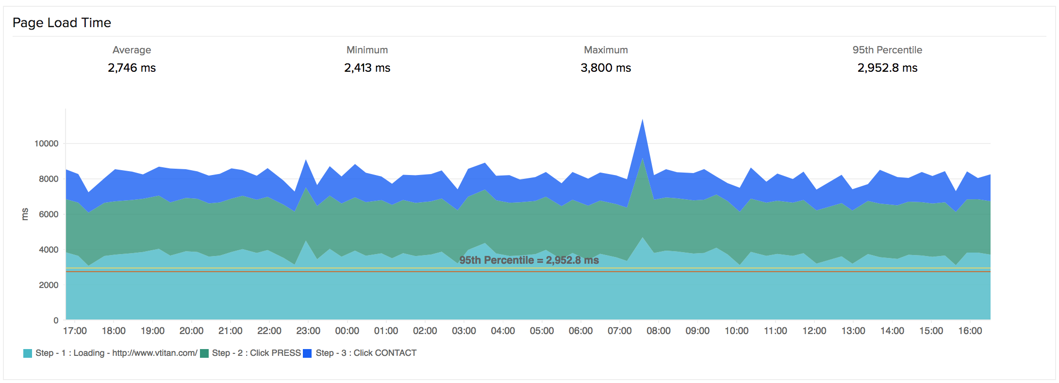 The actual page load time of a website transaction takes into account the entire page load time of an individual step in the transaction, inclusive of the HTML content, along with the images and other components. It takes into account the load time, mouse hover actions, button clicks for each individual step. The Page Load Time metrics is graphically displayed by defining the average and 95th percentile values taken for the configured page to load during monitoring for the selected time period. Location wise page load time data is also captured and represented in a tabular and graphical format.