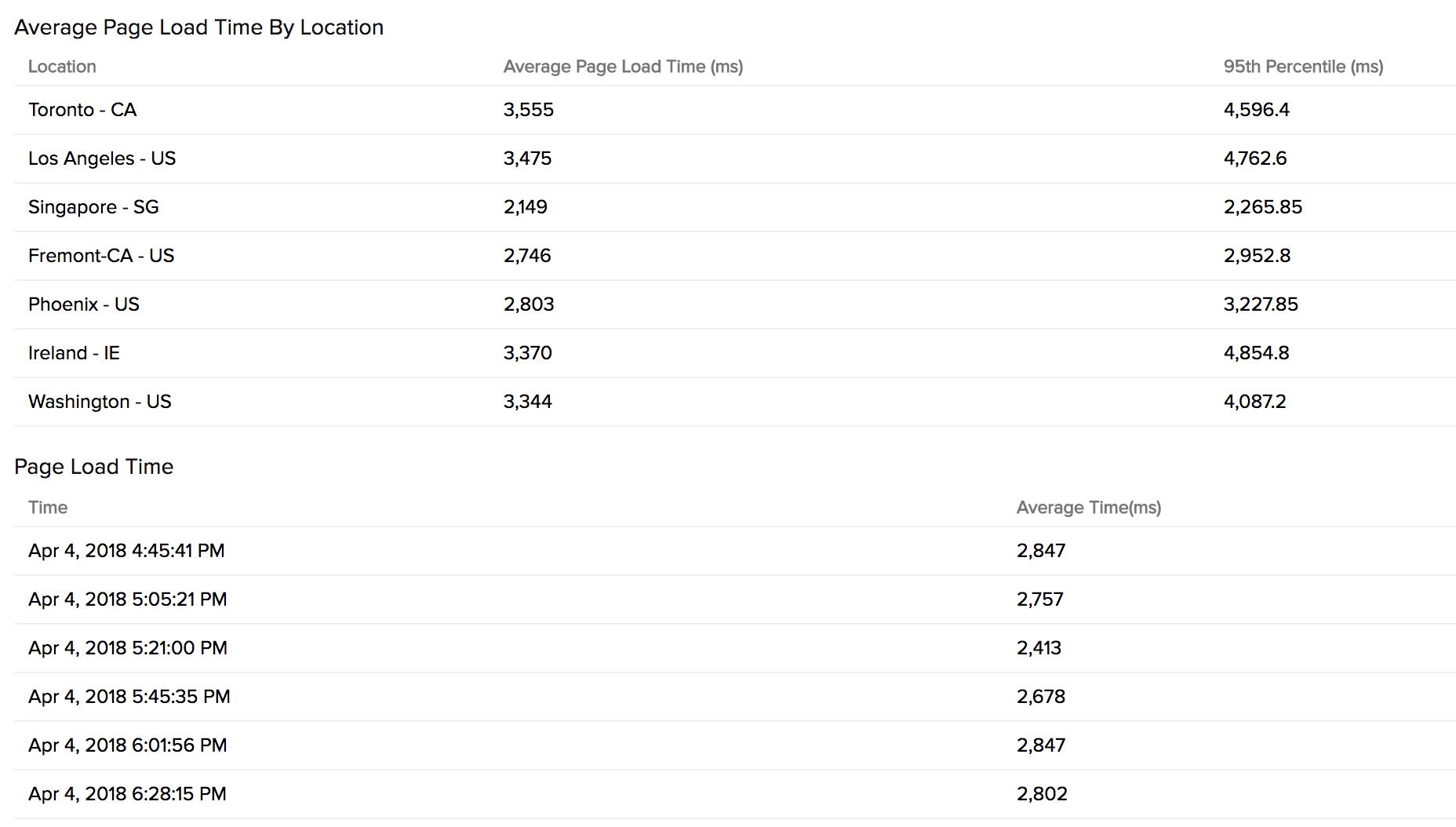 The average and 95th percentile page load times of individual steps in a transaction can be segmented based on location and time period. This data is provided to you in a tabular data.