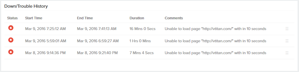 It offers detailed insight into the trouble/down history of your monitor. You can view the status, the exact downtime, duration, and specific reason for the down status.