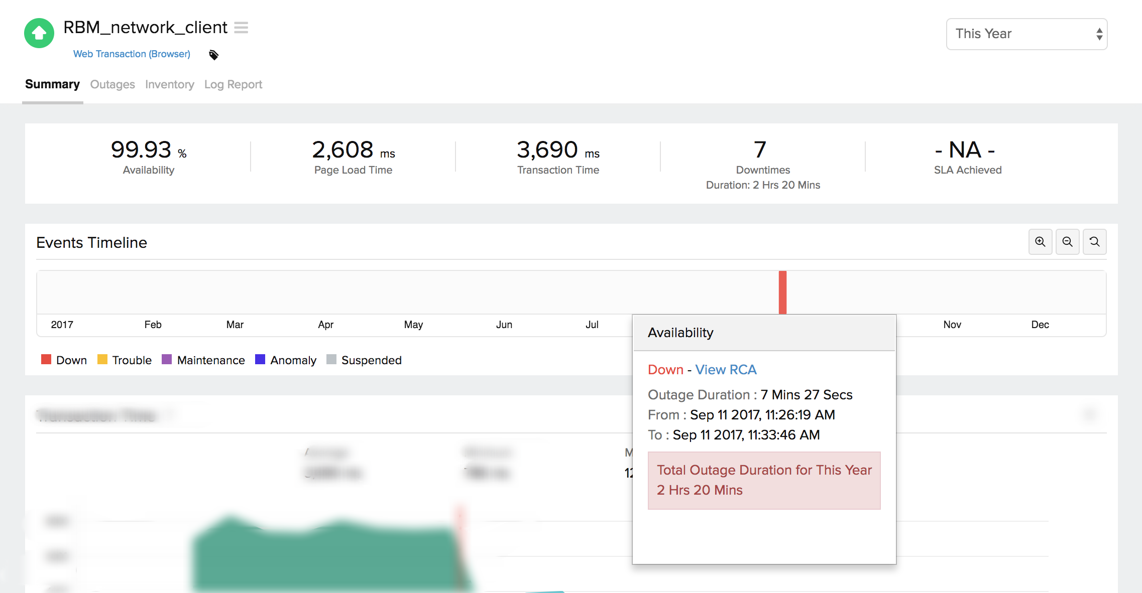 A quick summary gives you insight into metrics like: Availability, Page Load Time, Transaction Time, Number of Downtimes and Downtime Duration and the SLA status. Events timeline widget records all the past events of your selected monitor for a selected time range. You can identify/decode various events from the past, which includes Down, Critical, Trouble, Maintenance, Suspended, or Anomalies. Each event are color coded for easy identification. Events can be drilled down to extract maximum data and facilitate easy troubleshooting. You can also track the actual outage period and the total outage duration during a specific block of time.