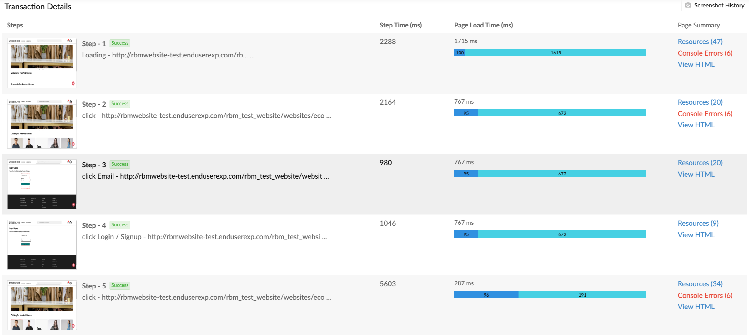 Additionally, this report displays the step details of your transaction, which helps the users identify trends and potential issues. This report displays the screenshots for each step, along with the Step Time and Page Load Time. The Page Summary includes details such as the Waterfall chart, HTML, and Console Errors.