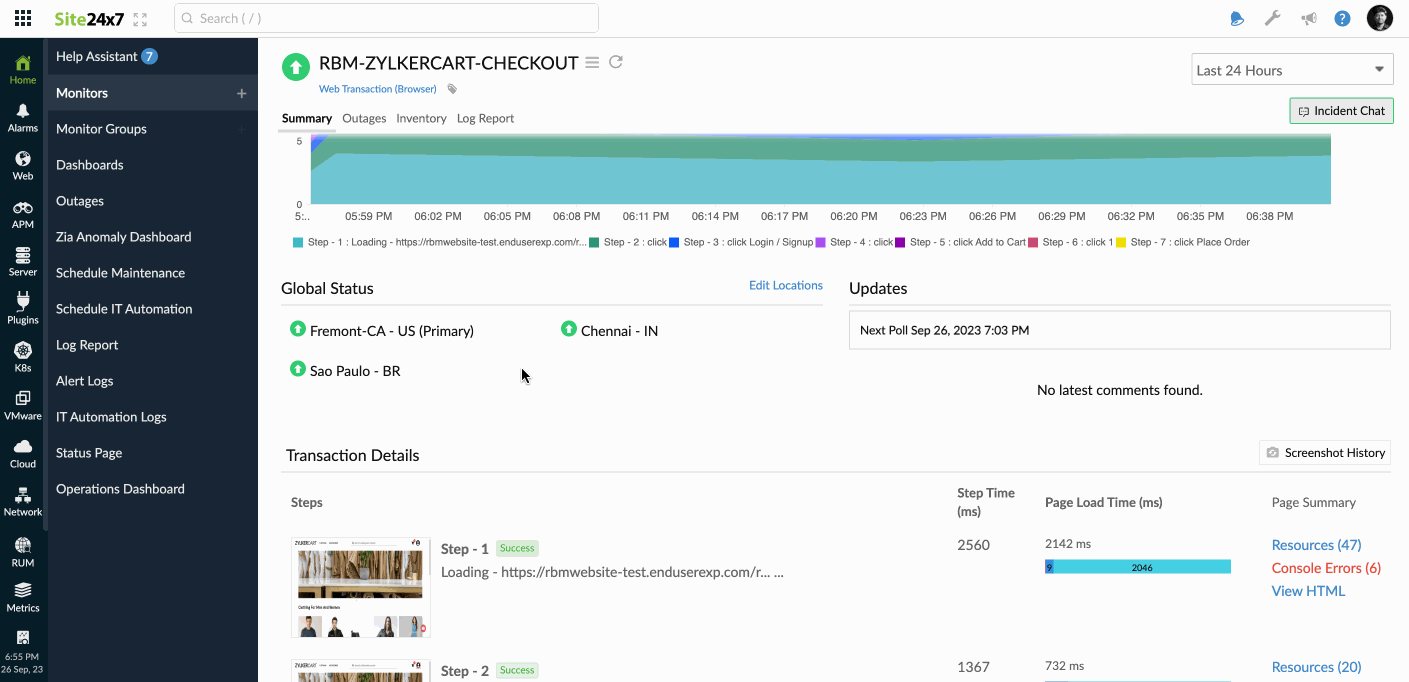With transaction details you can analyze the performance of your site with the help of detailed options like screenshots of each step, step time, page load time, the step name, resource-level waterfall chart for each page, and console errors that were raised in each step. Screenshots can be used to analyze how each step has performed and how the website has loaded. Step time helps you analyze the time taken for page load and the time taken by the actions involved in specific steps. Page load time helps to analyze the time taken by each page in the transaction.
