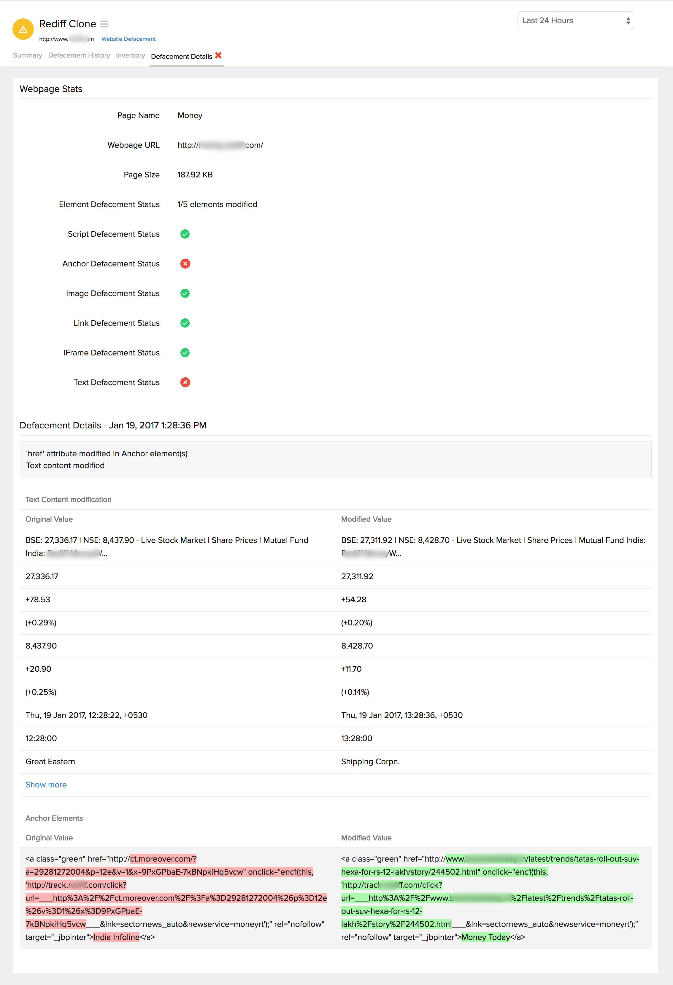 - Link Defacement - Identify 'href' attribute changes in the link element of the website page.