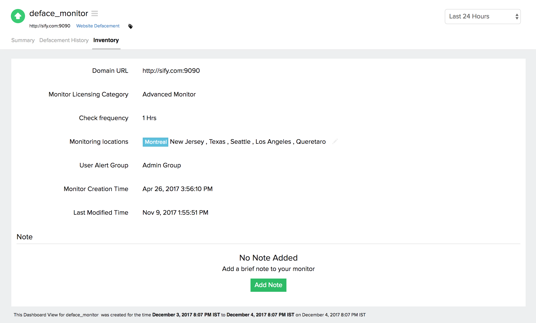 This section captures the basic monitor information and also its various configuration settings including polling locations, poll interval, licensing type, and more. You can additionally collaborate on a monitor by adding note.