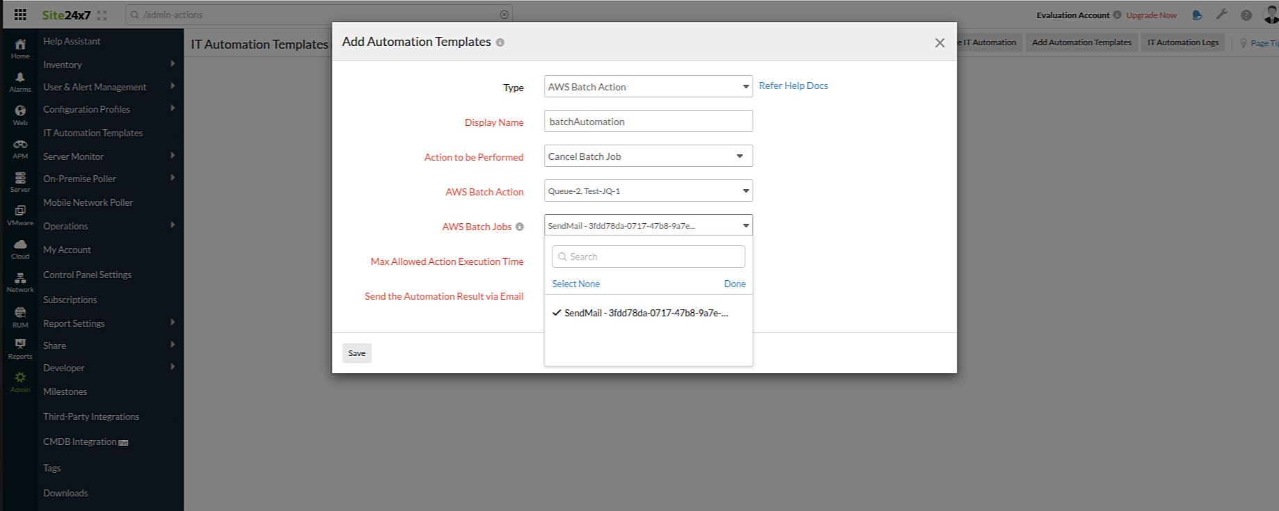 Using Site24x7's IT Automation framework, you can create an action profile to cancel or terminate AWS Batch jobs. You can also configure automated tasks to trigger when there's a change in the status of the monitor or in individual attributes.