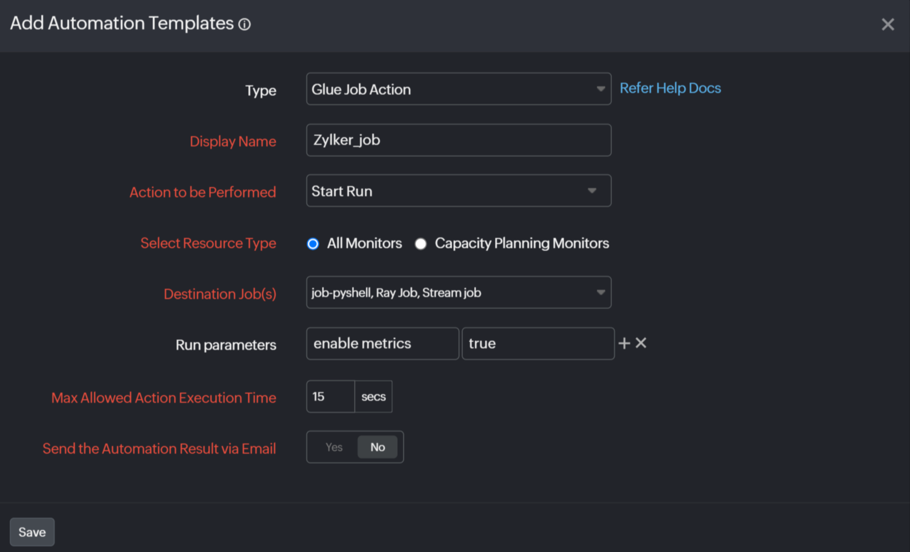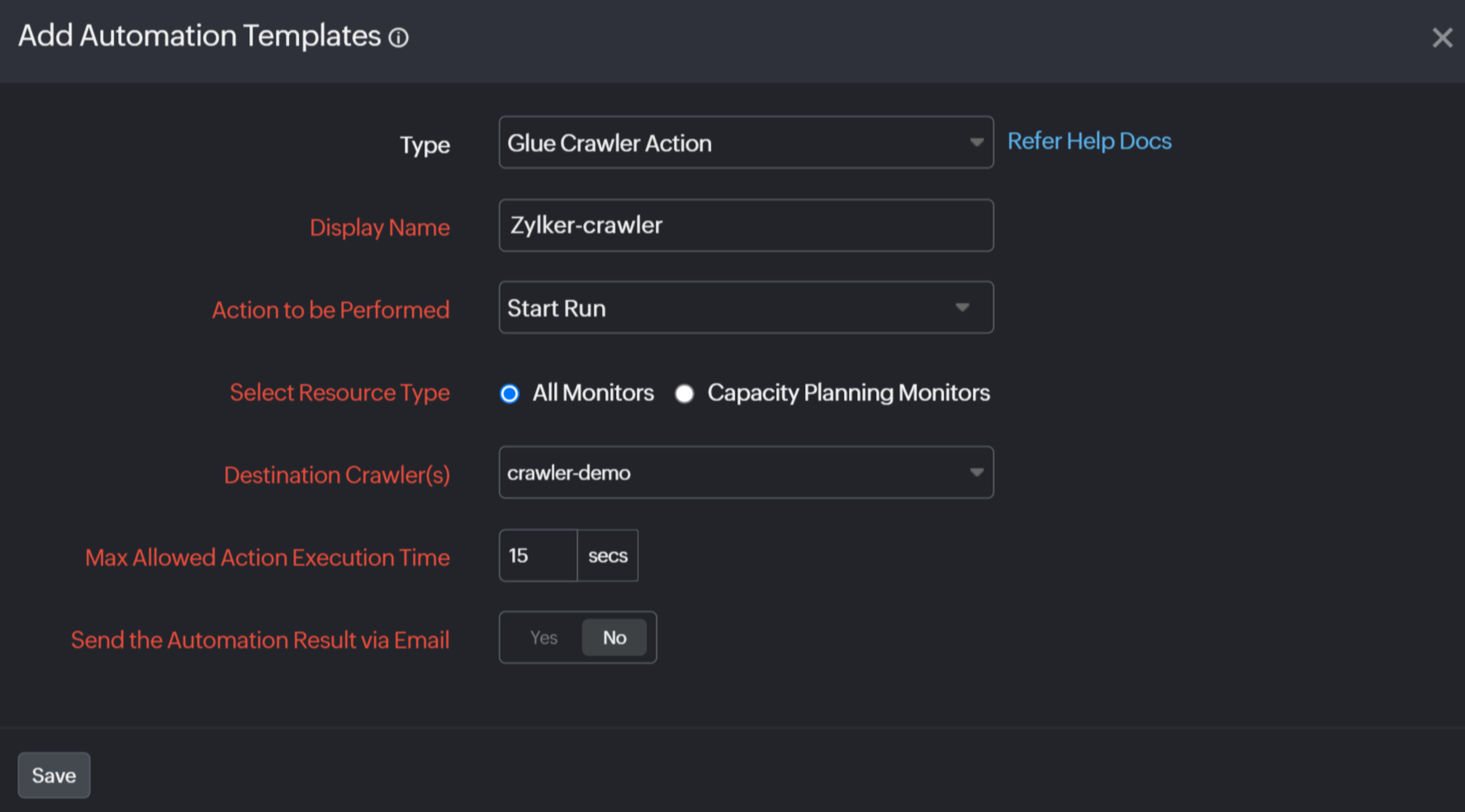 Using Site24x7's IT Automation framework, you can create an action profile to start a Glue Job run and a Glue Crawler run. You can also configure automated tasks to trigger when there's a change in the status of the monitor or in individual attributes.