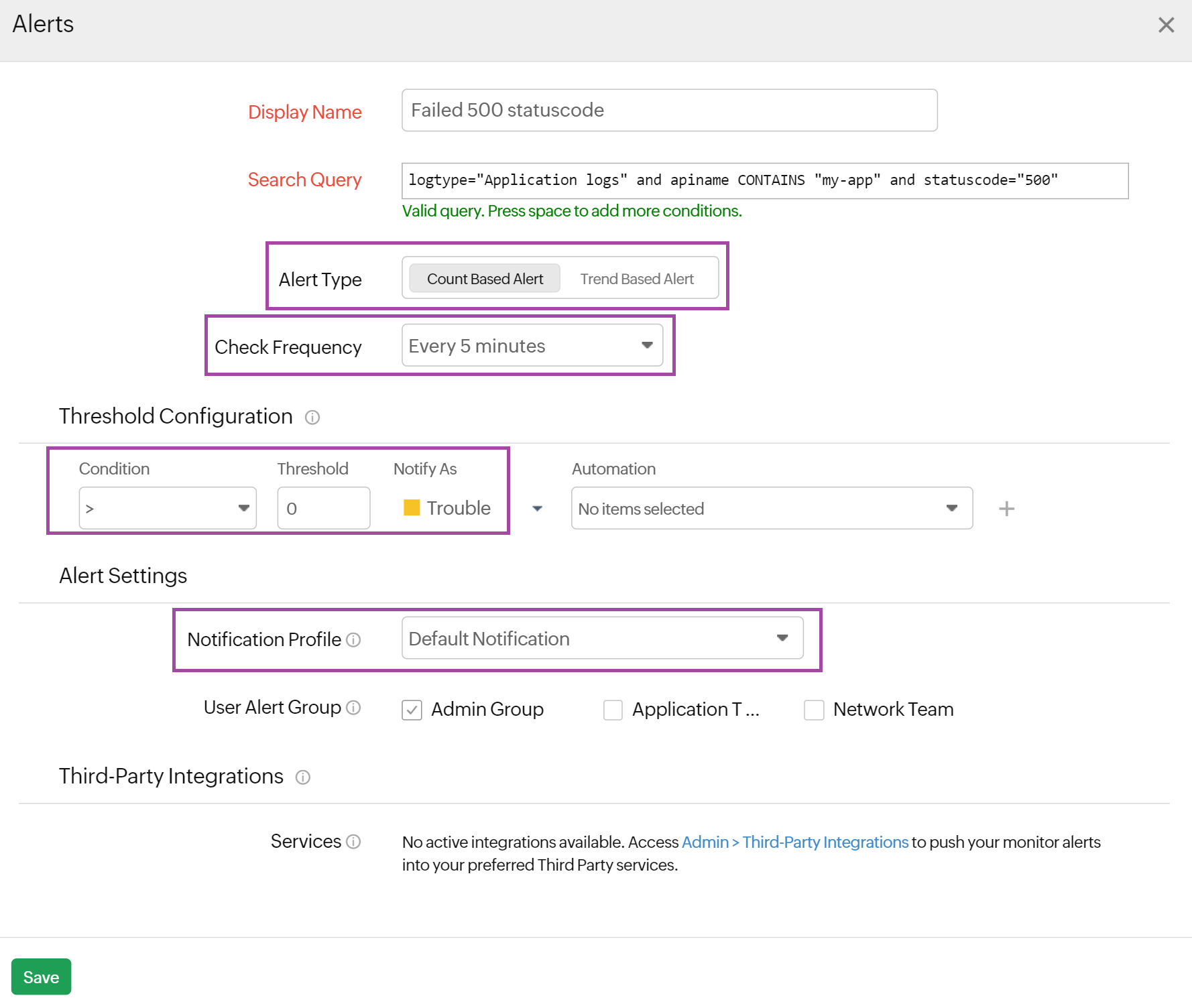 • Count Based Alert: Count is simply your number of log lines, beyond which you'll receive alerts.