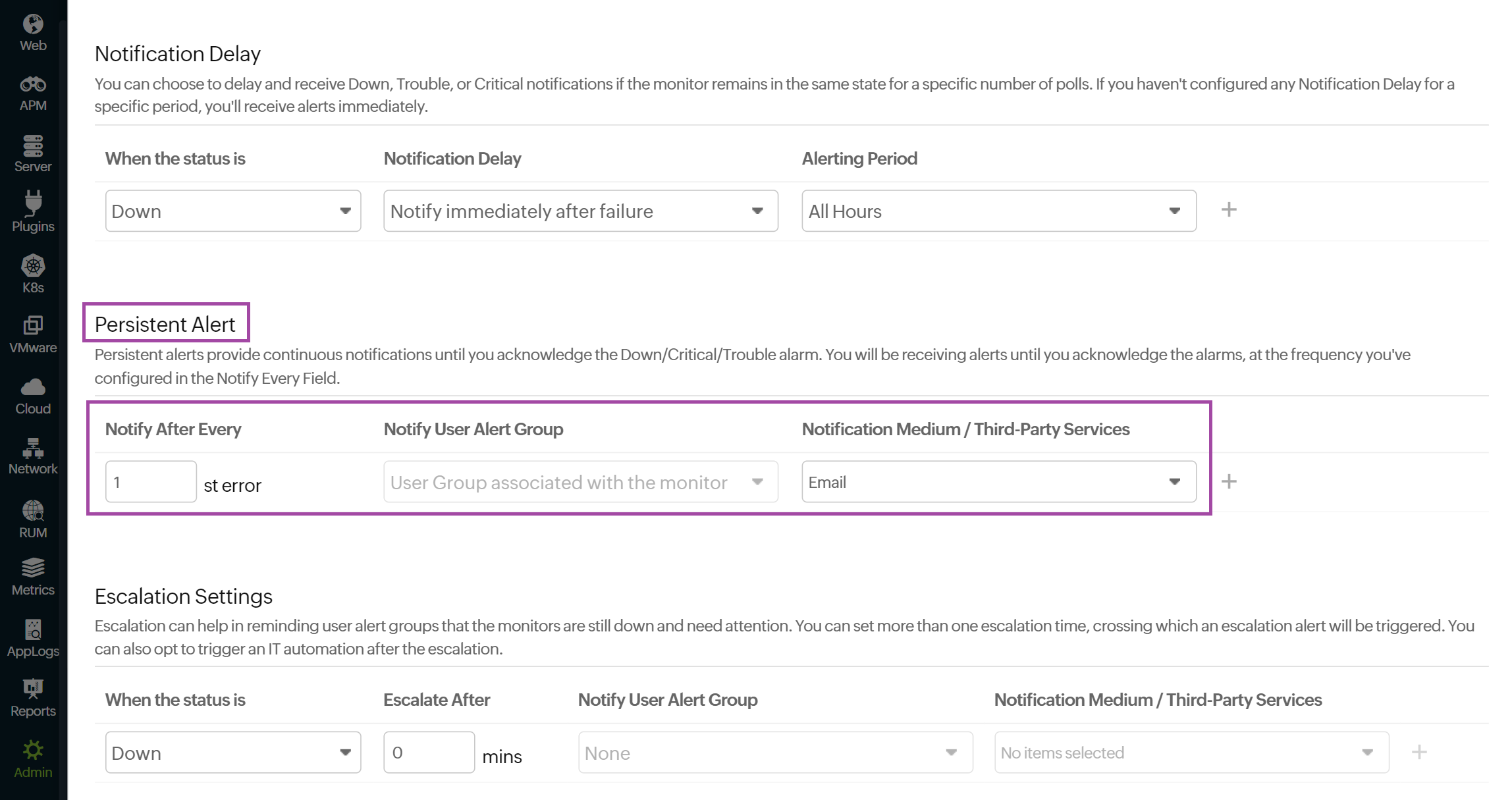 To ensure continuous notifications, configure persistent alerts in the notification profile associated with the log type monitor. Persistent alerts provide ongoing notifications until you acknowledge the critical or trouble alarm. They operate based on the frequency set in the Notify After Every field.