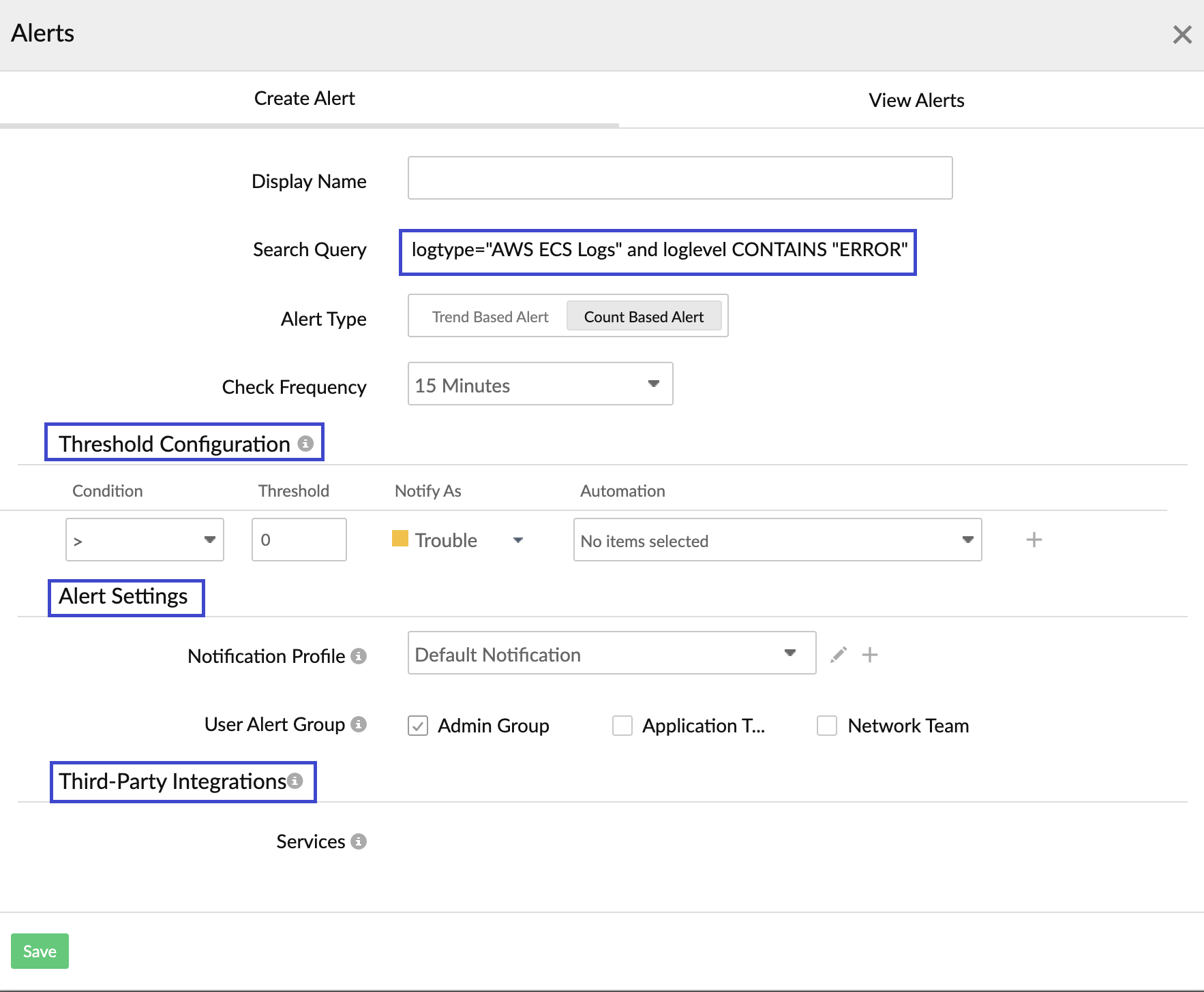 3. Select AWS ECS Logs from the Log Type drop-down.
