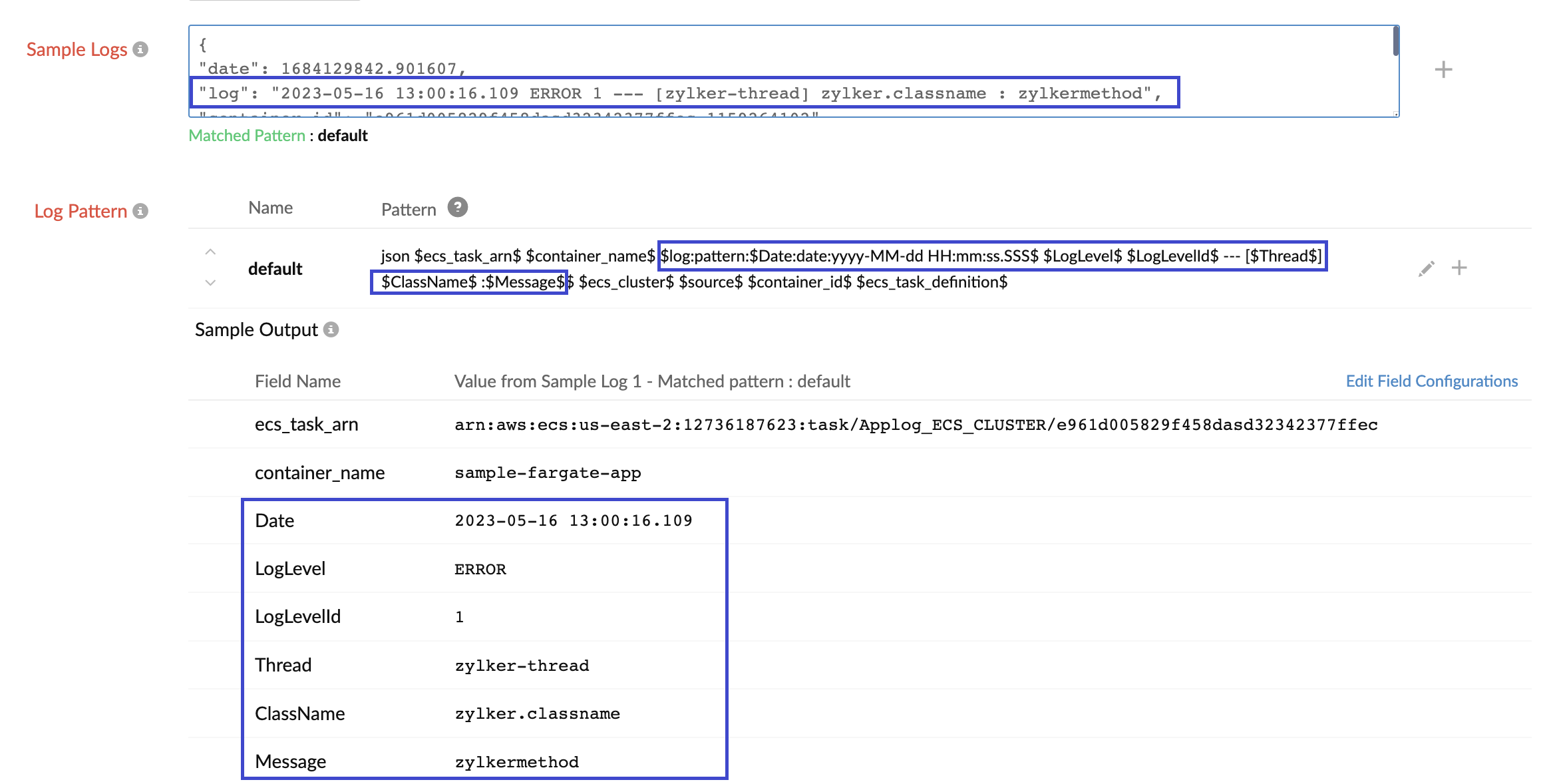 As every application writes logs in varied patterns, you can customize the log pattern based on your sample log lines.