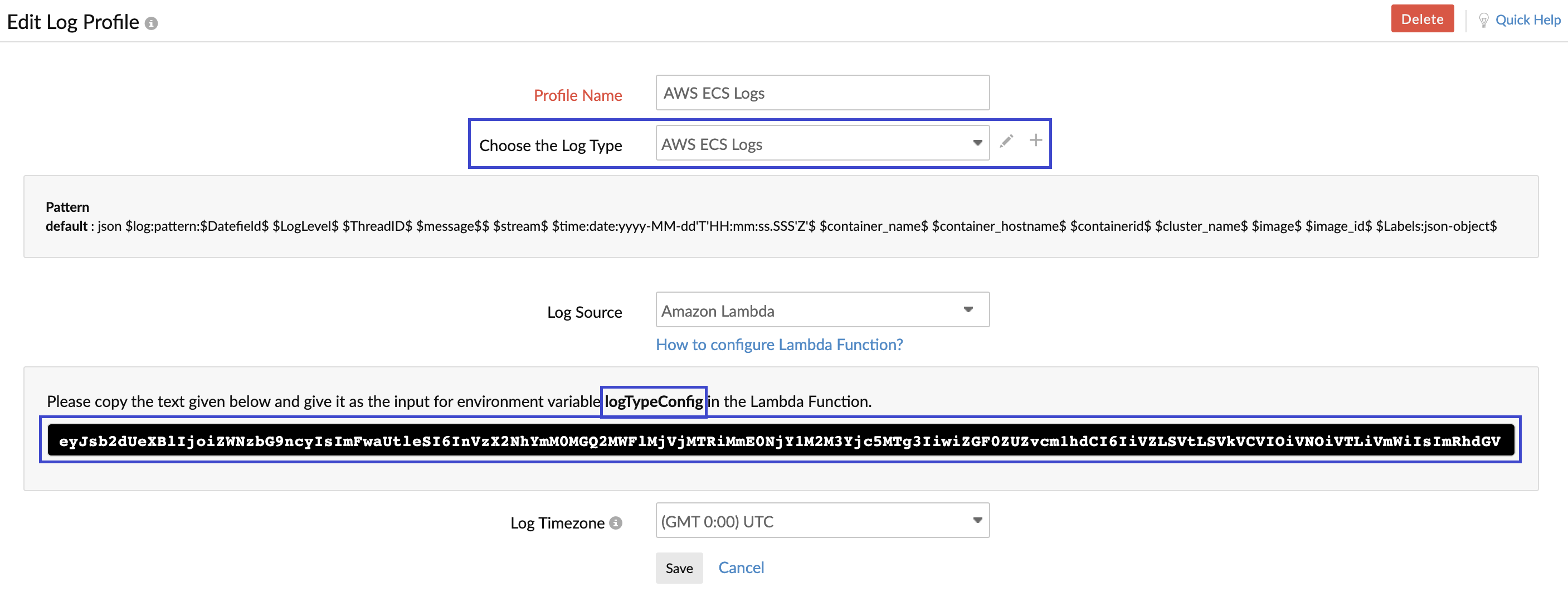 2. Follow the instructions in the AWS setup section of this document to collect the CloudWatch logs and view them in Site24x7. However, make sure you choose AWS ECS Logs, its logtypeconfig, and the ECS container log group, and continue the instructions defined in the same document.
