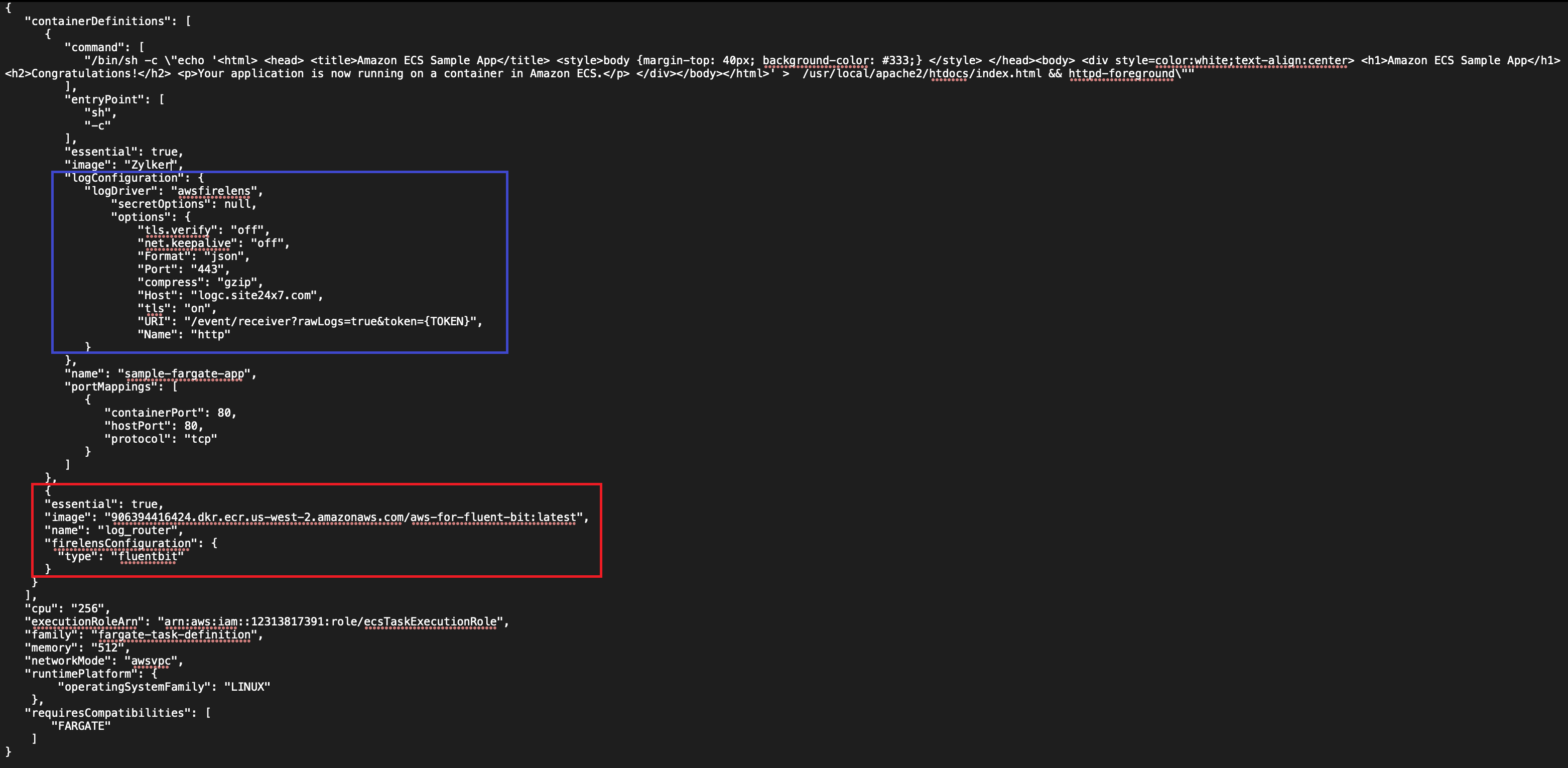 2. Here is an example snippet of a task definition where FireLens is the log driver and outputs data to Fluent Bit.