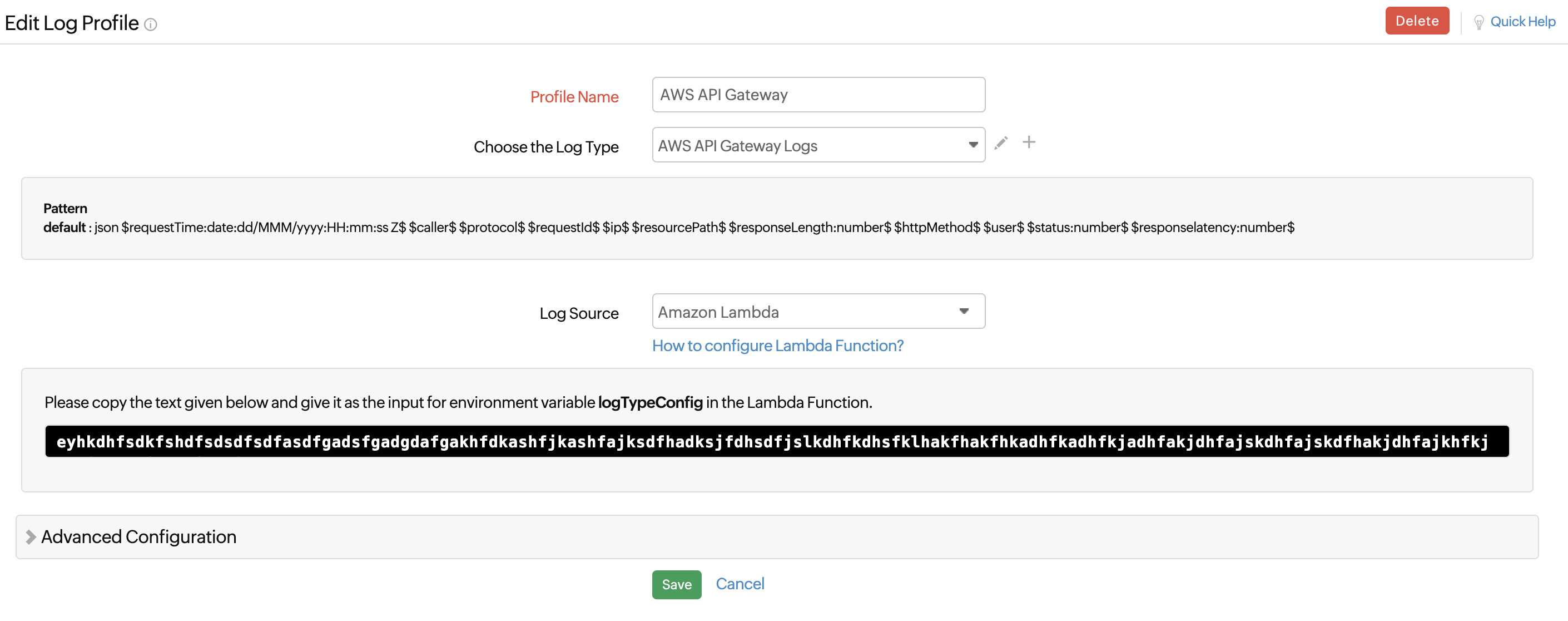 The first step to monitor AWS API logs is to create a Log Profile for them in Site24x7 AppLogs. To create a log profile: