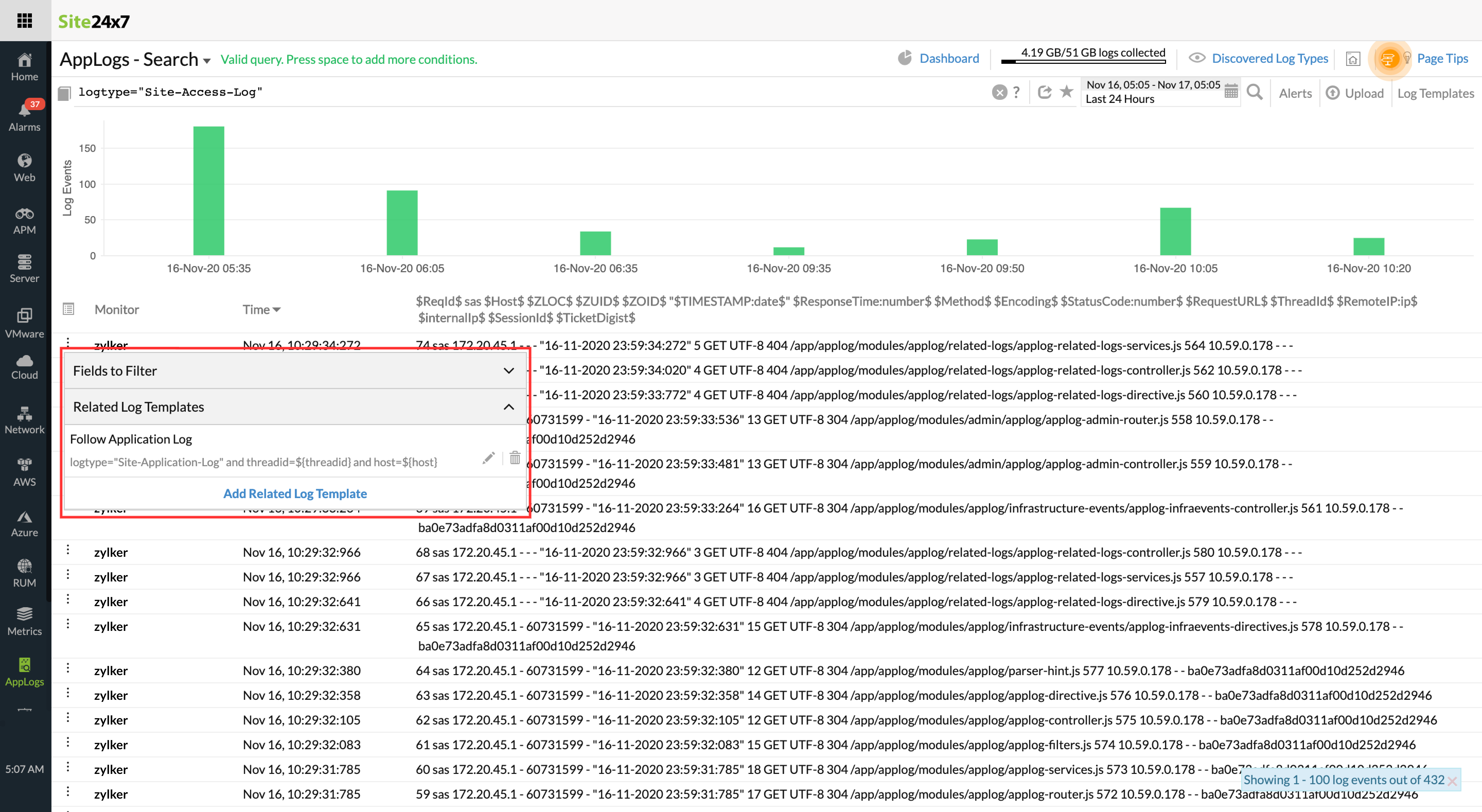 Let's consider you're debugging using access logs and application logs separately. First, you check the access logs, and for a particular entry in it, you want to view the related application logs. Here, you can use the Related Log Templates by matching the common fields (e.g. ThreadId) between the two log types by providing the time frame. This will take you to a new tab wherein the application logs are searched through with the given condition.