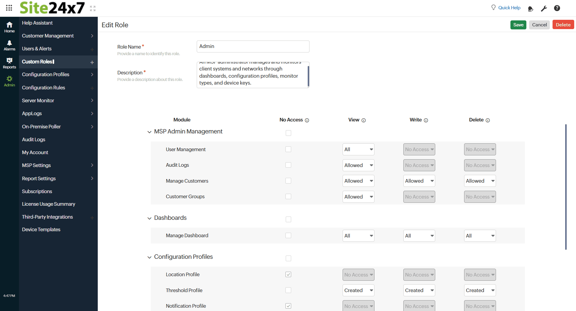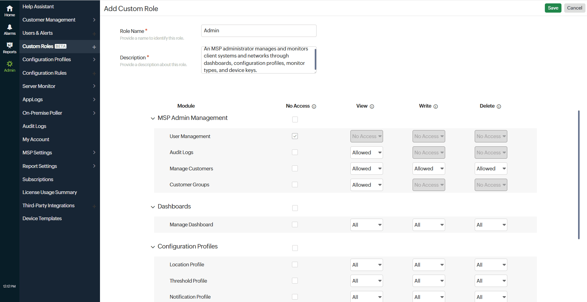 - On the Edit Role page, the MSP Admin Management, Dashboards, Configuration Profiles, MSP Monitor Types, and Device Key access permissions can be customized.