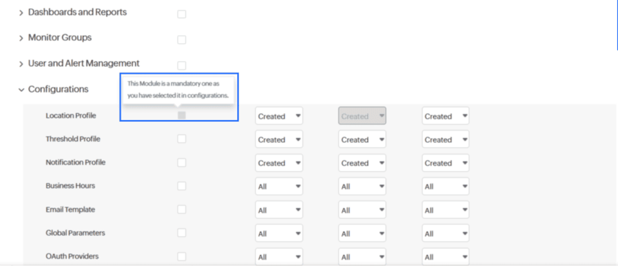 Configurations: Assign required permissions to various configurations profiles like Location Profile, Notification Profile, Threshold Profile, Business Hours, Email Template, Global Parameters, OAuth Providers, Web Tokens, APM Agent Configuration, and APM Key Transaction Configuration.