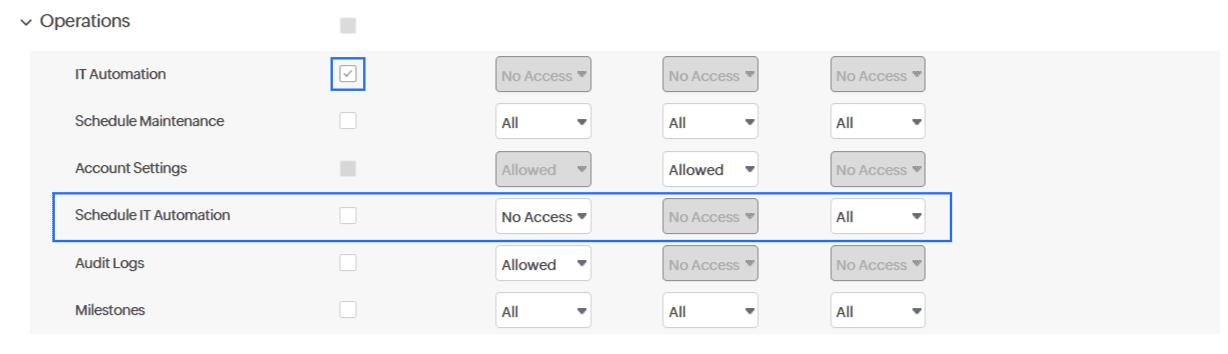 Operations: To assign restricted access to users for sensitive actions like IT Automations, Scheduled Maintenance, Account Settings, and Audit Logs, select varied permissions for each of the above actions. To assign IT automation permissions, ensure that you have configured IT automation for the associated resources. All actions except audit logs have All, Created, or No Access. And for audit logs, you can assign Allowed or No Access permissions.