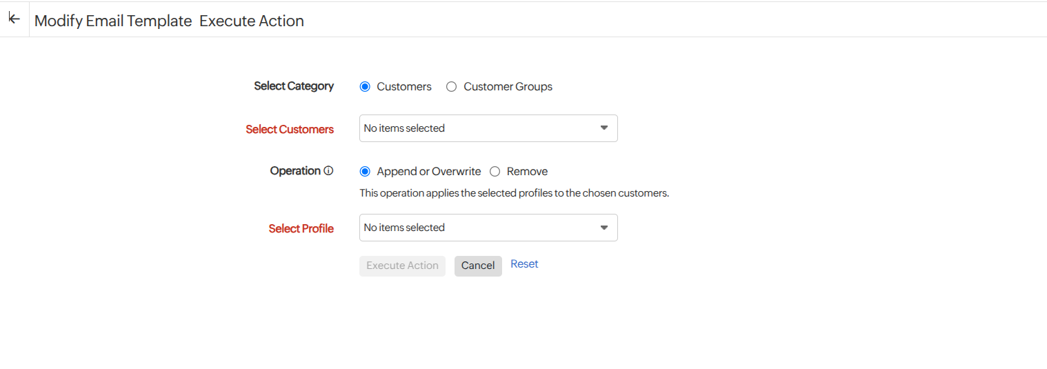 - Append or Overwrite: Assign the selected email template to the chosen customers or update an existing email template.