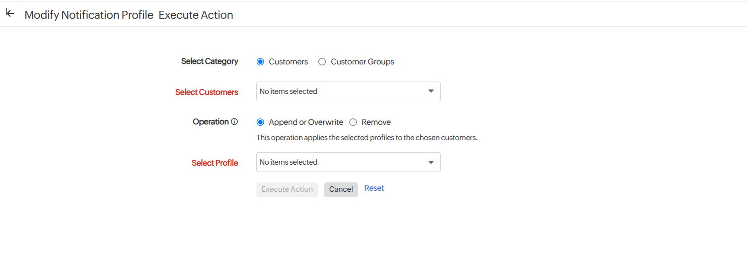 - Append or Overwrite: Assign the selected notification profile to the chosen customers or update an existing notification profile.