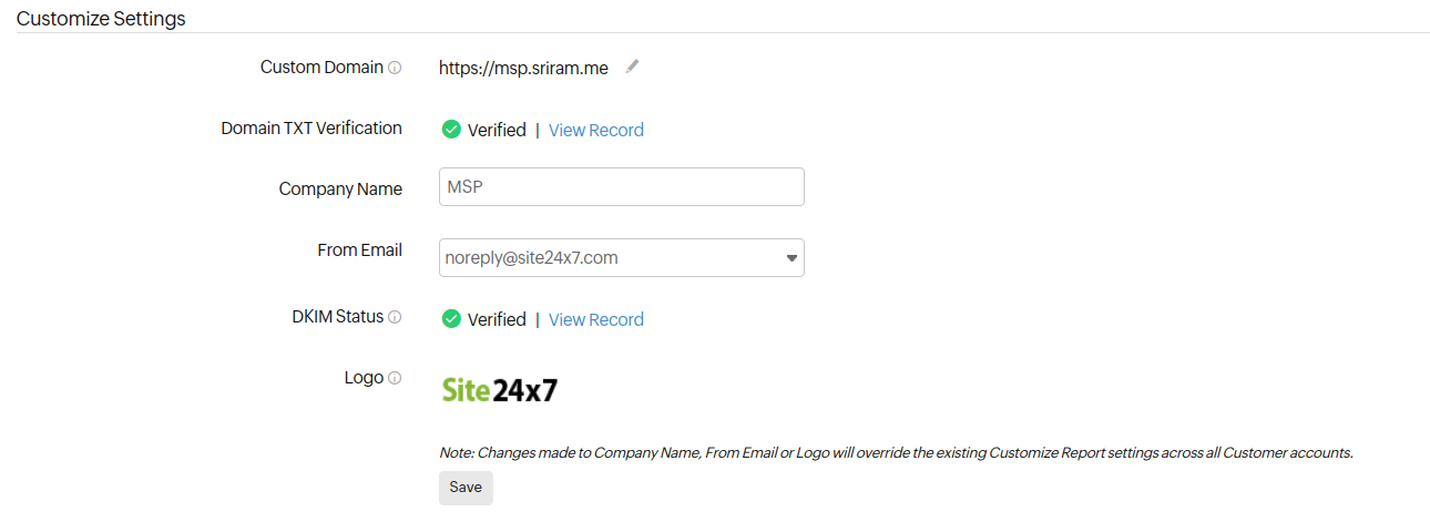 You can update your MSP Account's Custom Domain, Company Name, From Email address, and MSP Logo to facilitate rebranding and customization for Customer Report Settings.