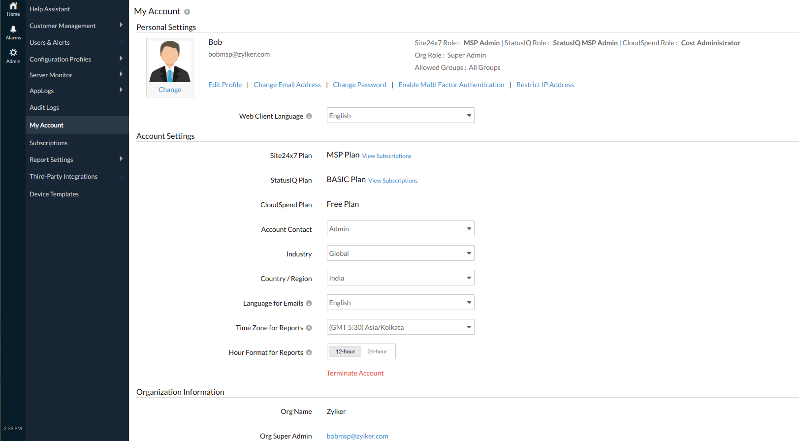 • Terminate Account: This option can be used to terminate your Site24x7 MSP account.