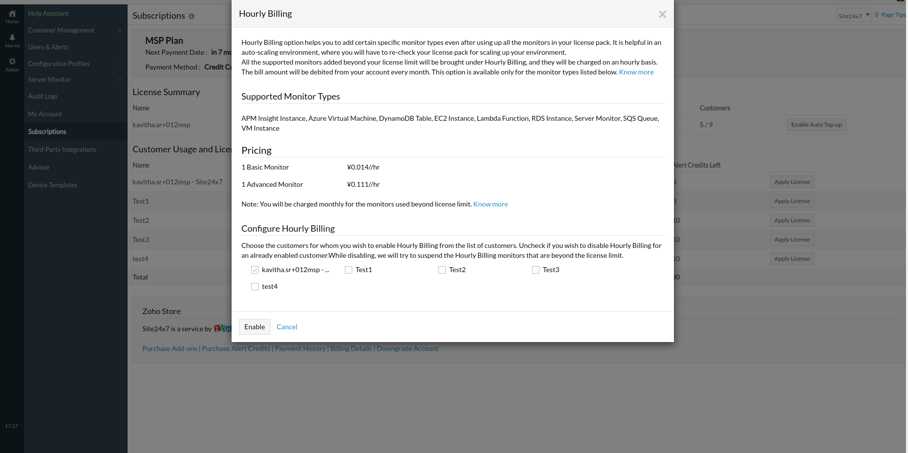 3. Click on the Configure Hourly Billing option provided next to the Hourly Pricing option and then click on the Enable button in the Hourly Billing pop-up that opens. Hourly Billing for selected MSP customers will be enabled.