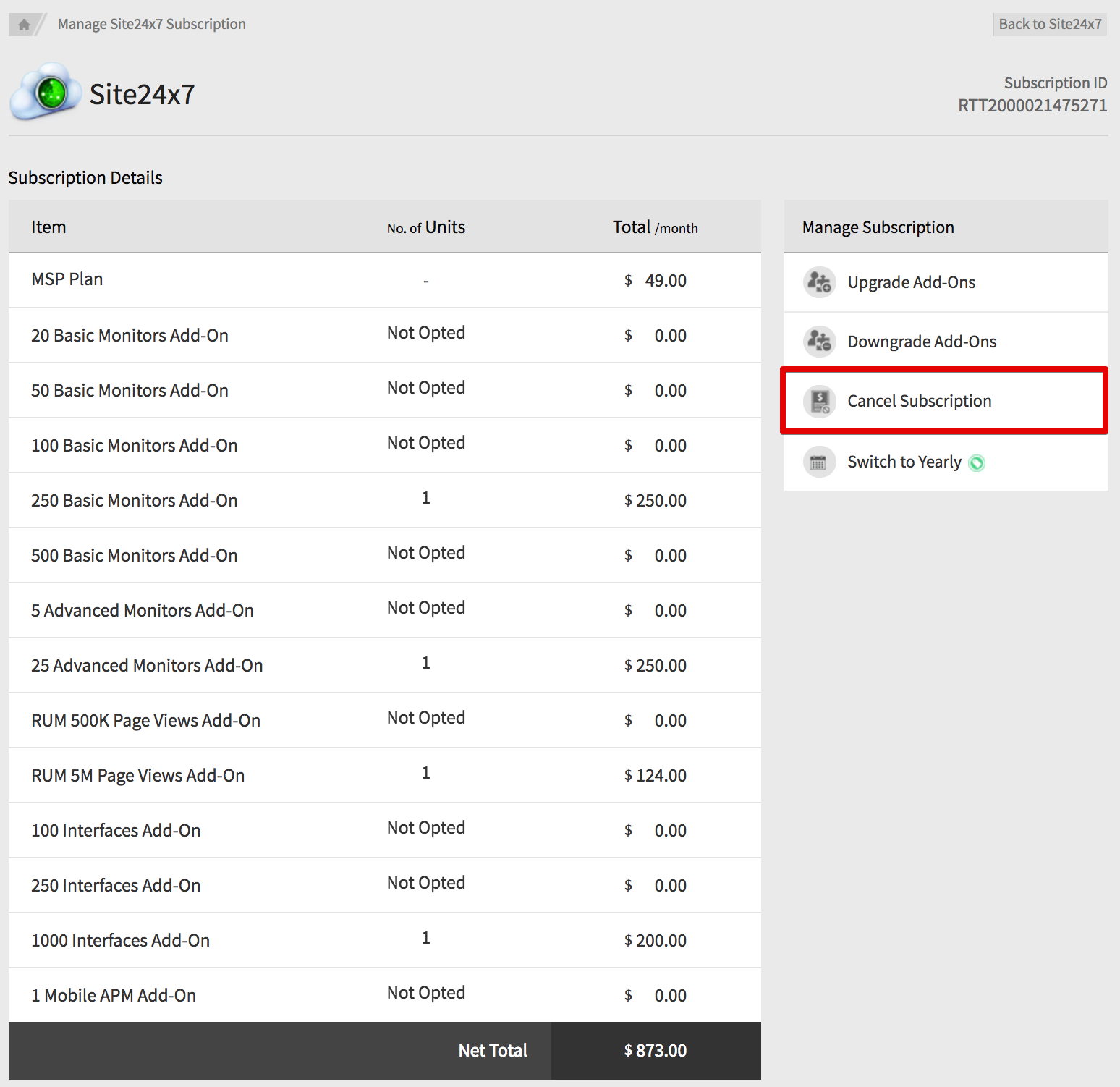 NoteThe subscription data is refreshed every three hours, and the page will not reflect each usage update immediately. To view the license count after updates, please contact support at support@site24x7.com.
