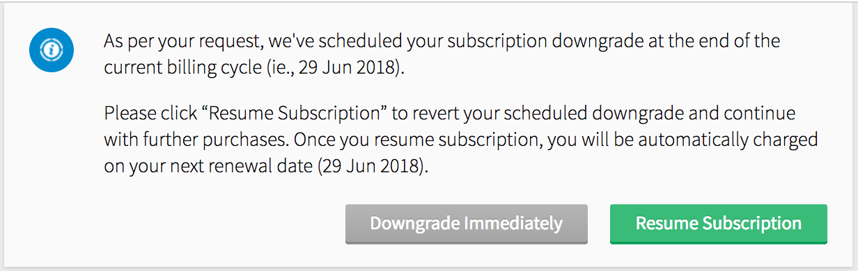 - If you've marked the check box "Downgrade automatically at the end of the current billing cycle", then you will be asked to either Downgrade immediately or resume the Subscription.