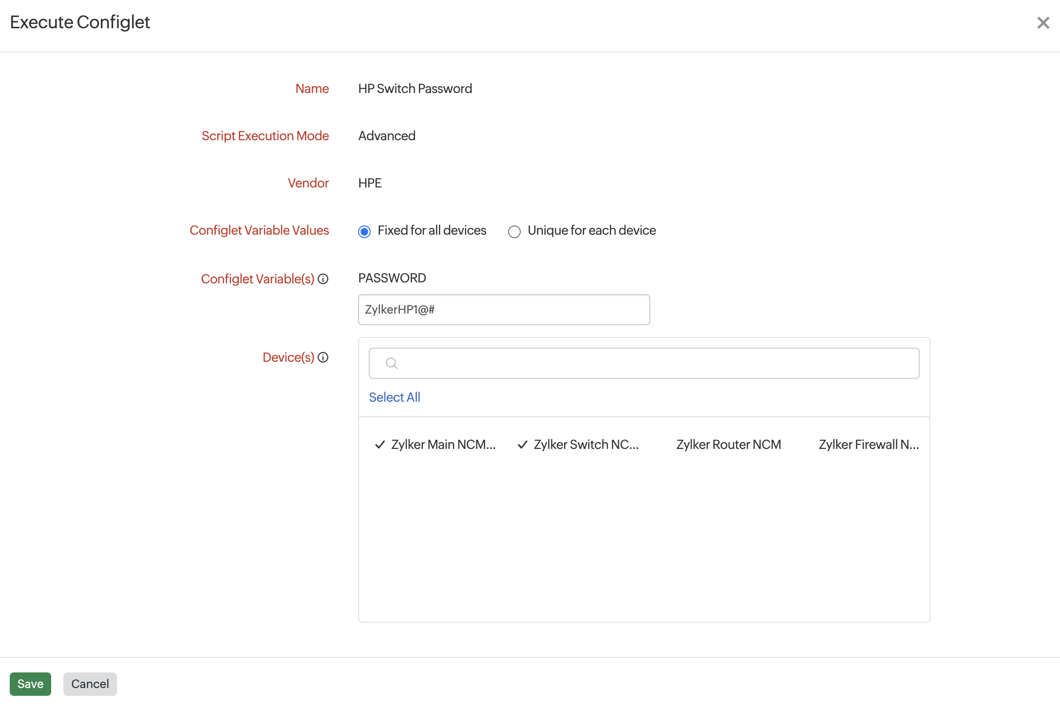 Often, there is a need to make changes to the running configuration of devices, and in most cases, the same set of changes needs to be applied to multiple devices. While network administrators can manually edit the configuration, the task can be challenging due to the volume of changes and the repetitive nature of the work. Site24x7's Network Configuration Manager (NCM) provides a simple solution through configlets.