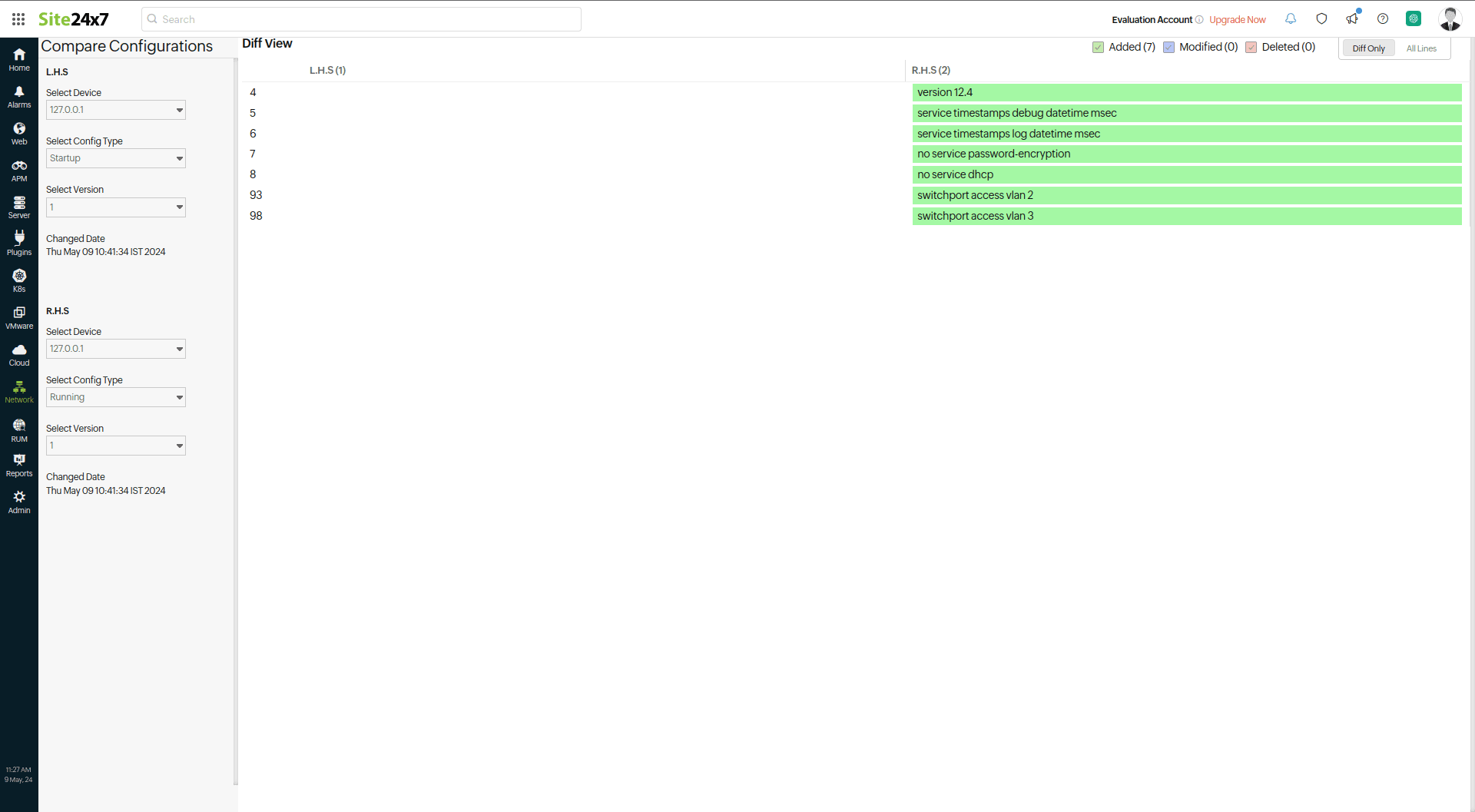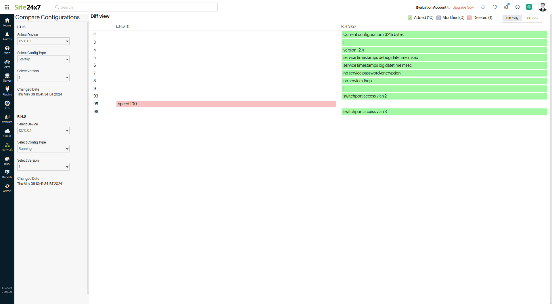 Site24x7's Network Configuration Manager (NCM) sends alerts if there is any change in the configuration file based on the threshold configuration. Additionally, you can also view if there are conflicts between any versions of the startup and running configurations.