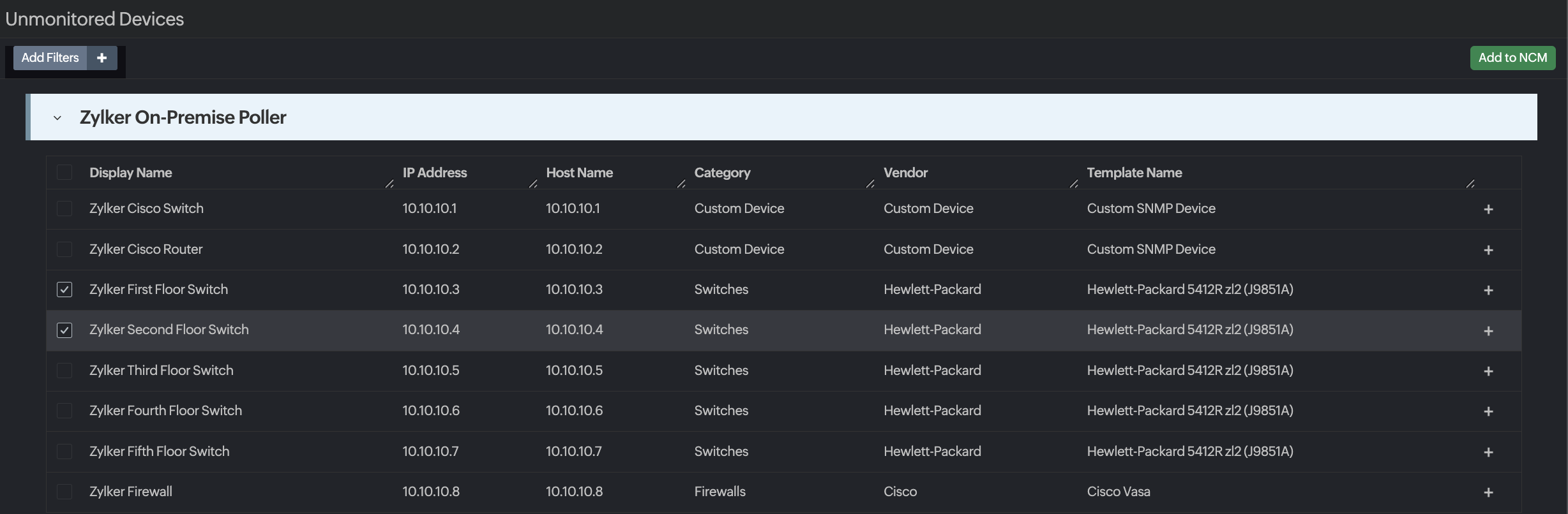 The Unmonitored Devices tab in NCM lists all the devices discovered by the On-Premise Poller that are added as network monitors but have not yet been added to Network Configuration Manager (NCM). This view helps you identify devices and bring them under NCM for configuration backups, compliance, and automation.