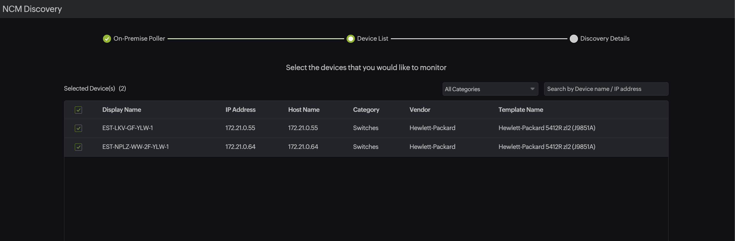 - Selected Device(s): Review the list of devices chosen for NCM monitoring.