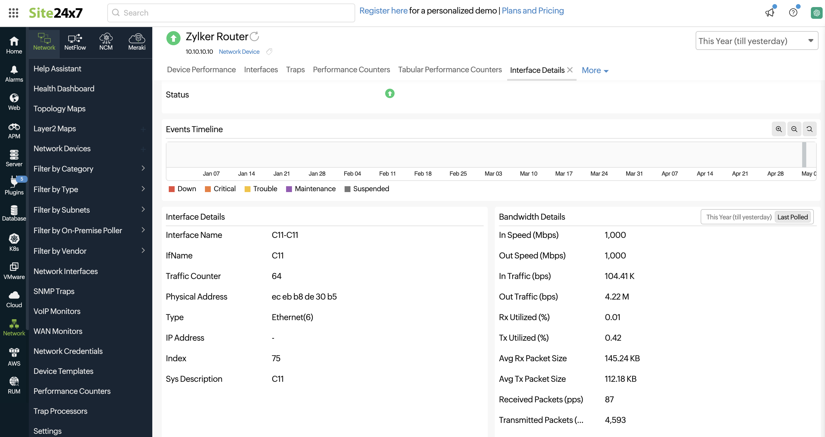 Displays the list of interfaces on the selected device with their statuses and other details. Click the interface name to view its availability as well as graphs on its traffic and bandwidth utilization.
