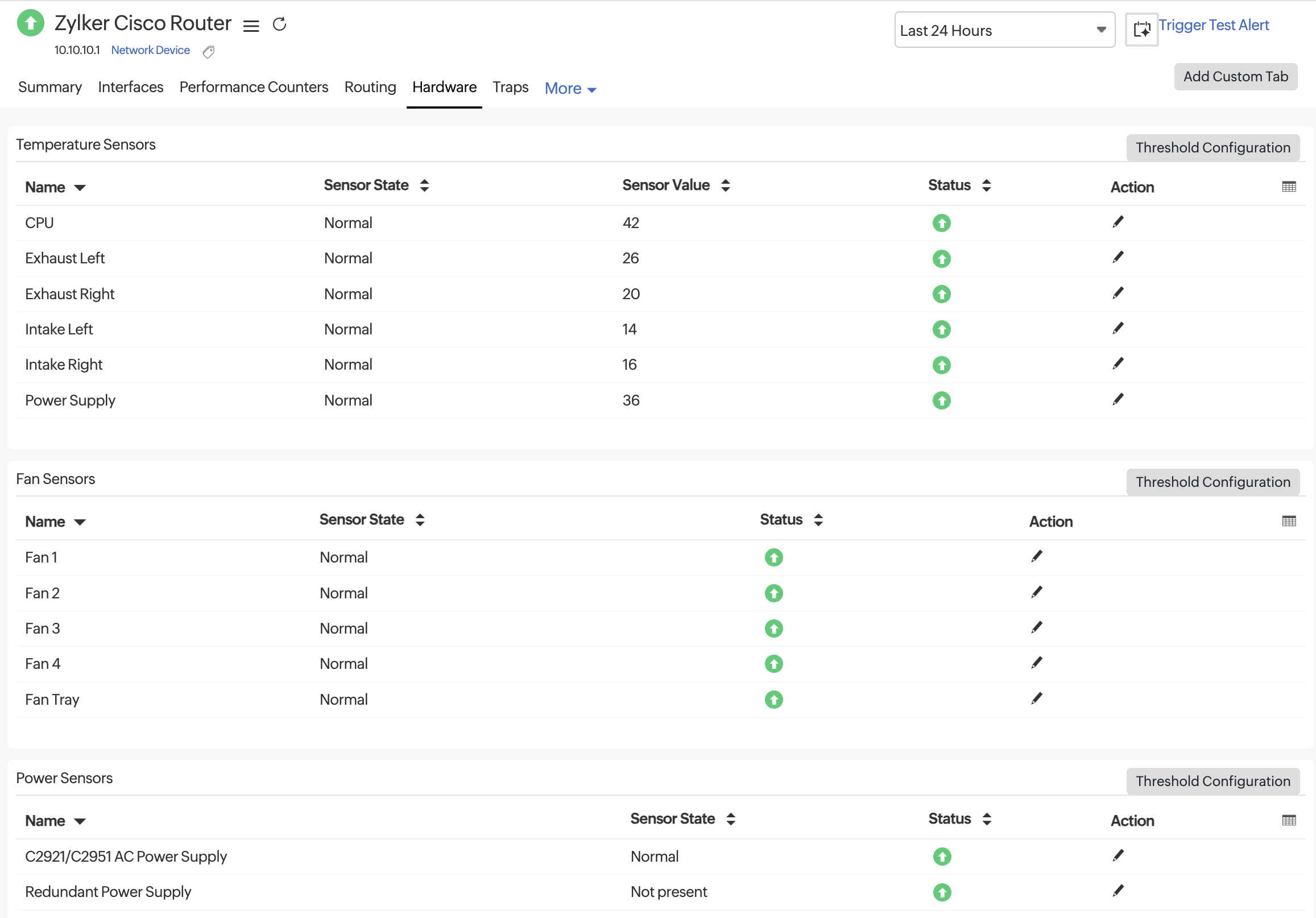 Monitor the physical health of your Cisco devices using the Hardware tab. This section displays sensor-level data such as the temperature, fan speed, and power status. You can view the Sensor States, Sensor Values, and Status and configure thresholds for each of the rows or categories as needed. The available sensors are categorized as Temperature, Fan, or Power sensors.