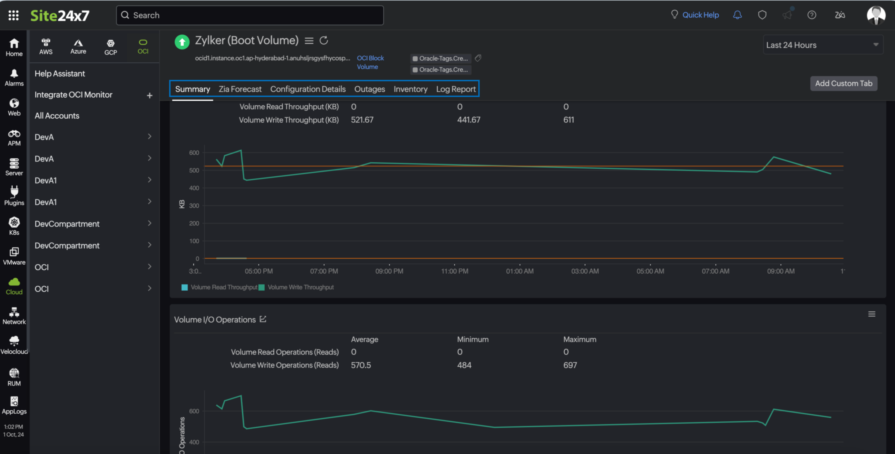 An organization running multiple virtual machines (VMs) on OCI relies on OCI Block Volumes for persistent storage. By integrating OCI Block Volume with Site24x7, the organization gains insights into the performance and usage patterns of their storage volumes.