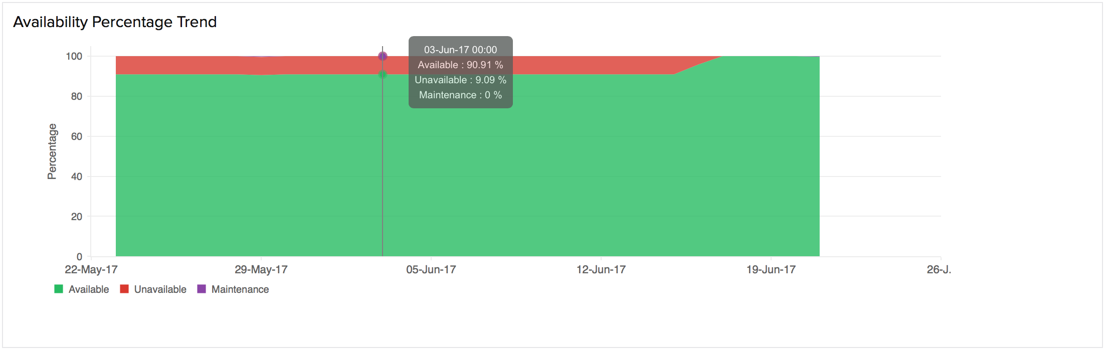 The availability percentage trend graph for the configured monitor plots the actual availability, downtime and the overall maintenance activity against a specified time period. You can also view actual availability, downtime, and marked maintenance percentage for a specified time by hovering the cursor over the designated area in the graph.