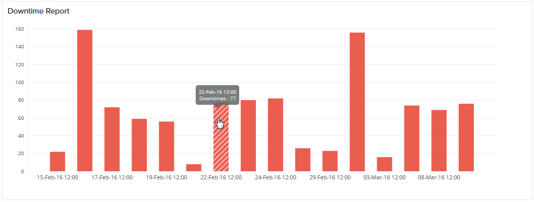 Downtime graph is mapped by counting the number of down times and plotting it against a selected time period. If the selected time period is within 24 hours, hour wise data will be plotted against X-axis. If the selected time range is outside 24 hours period, day wise data will be depicted against the X-axis.