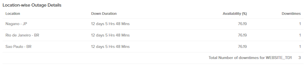 Get location based availability report of your configured monitor. Detailed insights into their Down duration, Availability percentage, and Downtime counts are provided to the end user.