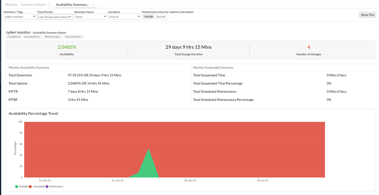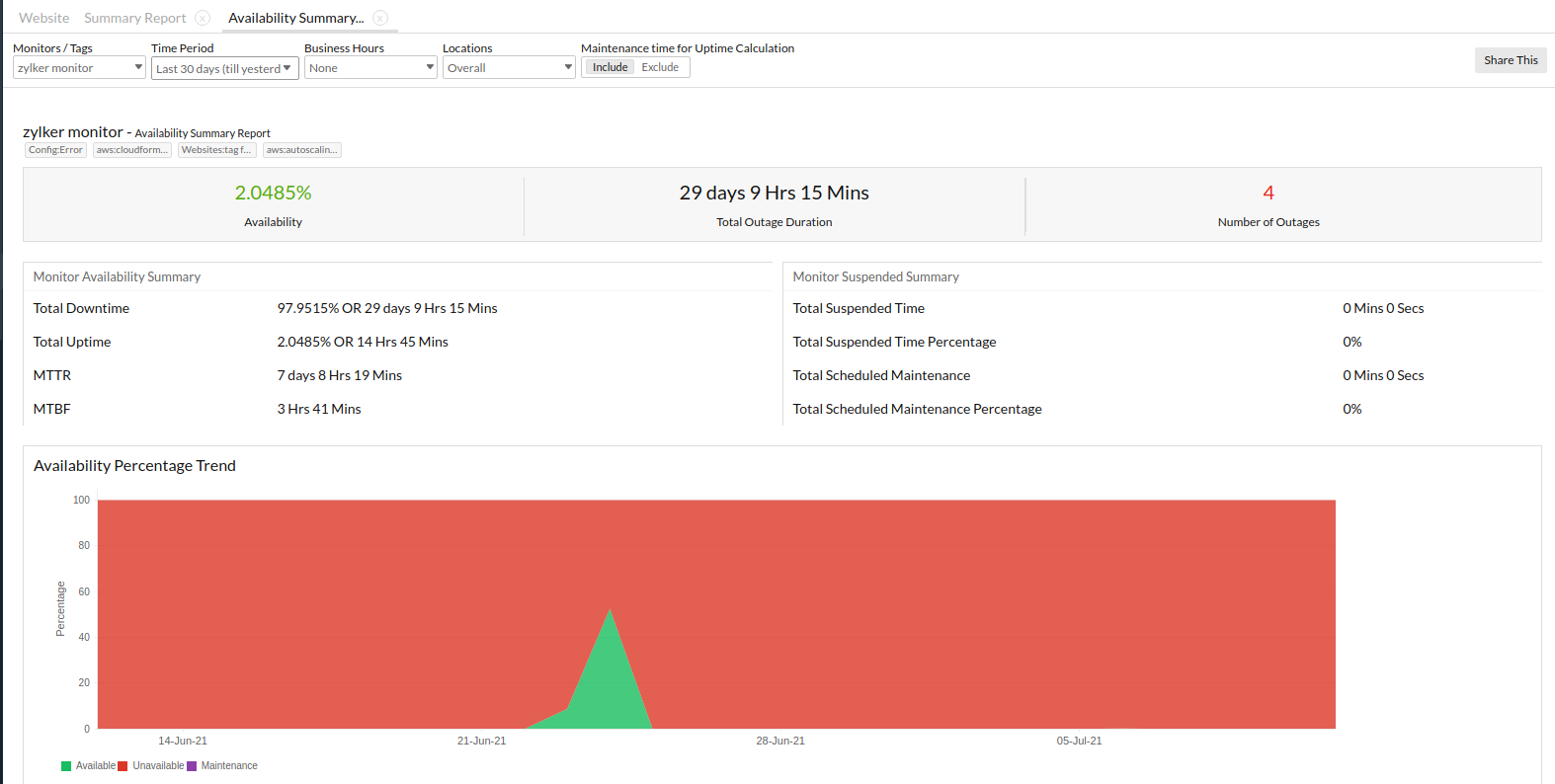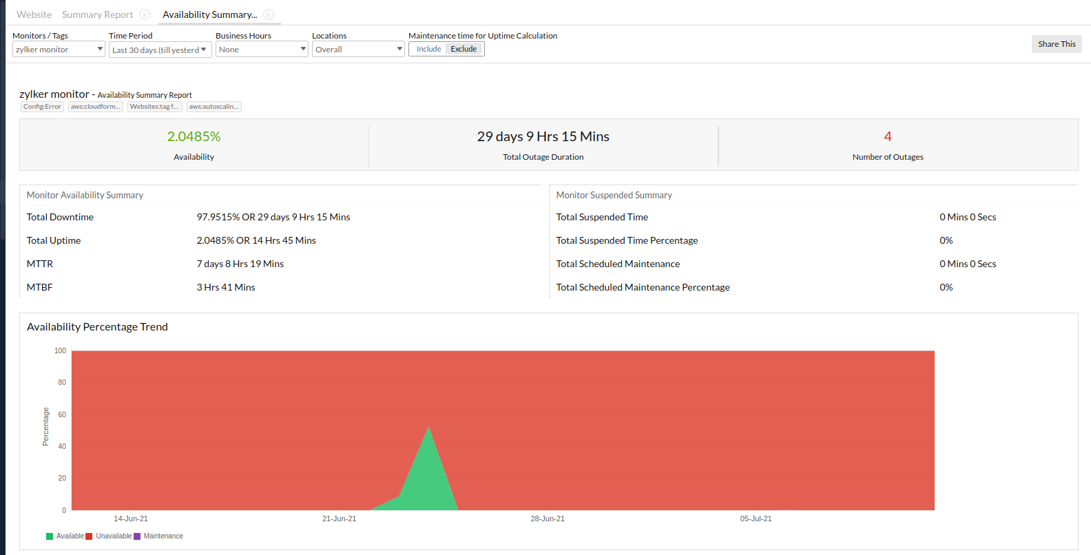 Our availability summary report offers exhaustive detail into the overall availability, outage and downtime of your configured monitors, for any chosen period of time. In a real-time business scenario, availability summary report gives a bird's-eye view of the overall availability of your configured monitors. You can generate the Availability Summary Report based on the Monitor or the Tags.