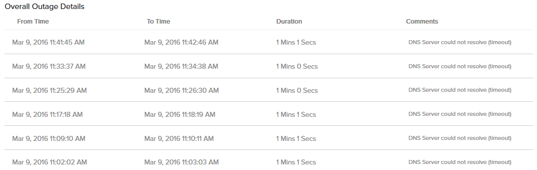 Overall Outage Details provide a detailed interpretation of the outages incurred by the relevant monitor. The user gets to know the exact time frame and duration of outage. For instance, a configured Real Browser Monitor would let you know the exact time span and duration when the monitor was down. Furthermore, you can find the exact cause behind the outage through comments.