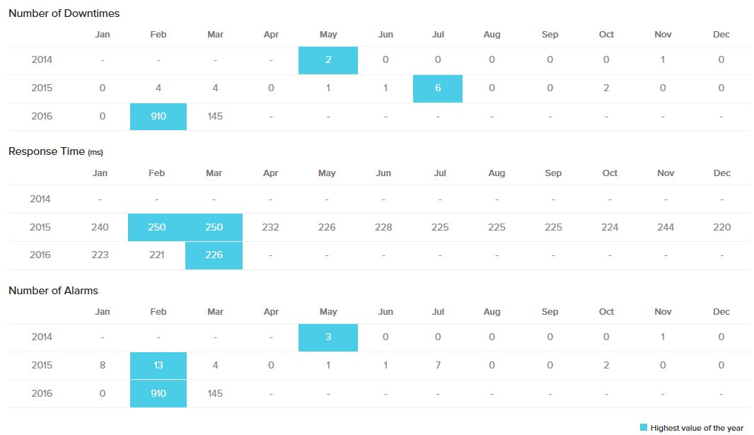 | Response Time | Average response times (ms) recorded by the monitor are captured in a table. The month with the highest response time is highlighted in red. |