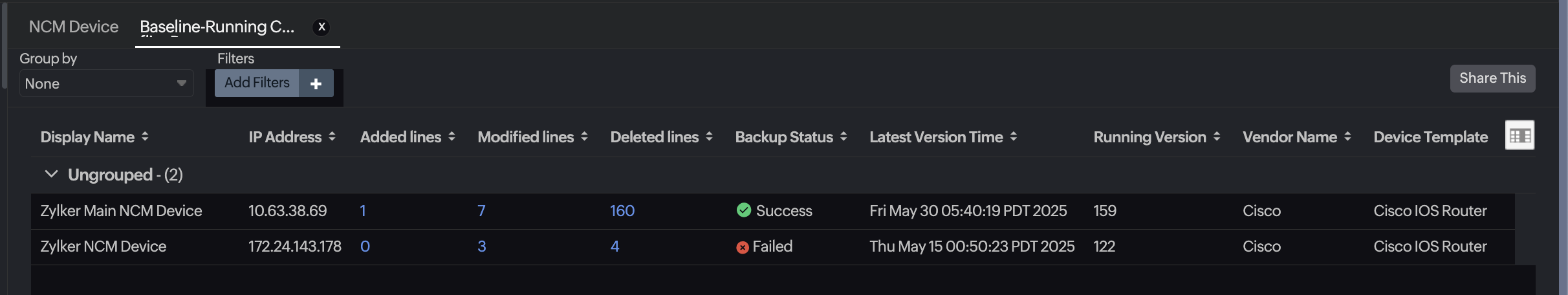 | Modified Lines | The total count of modified lines in the baseline running configuration compared with the current running version |
