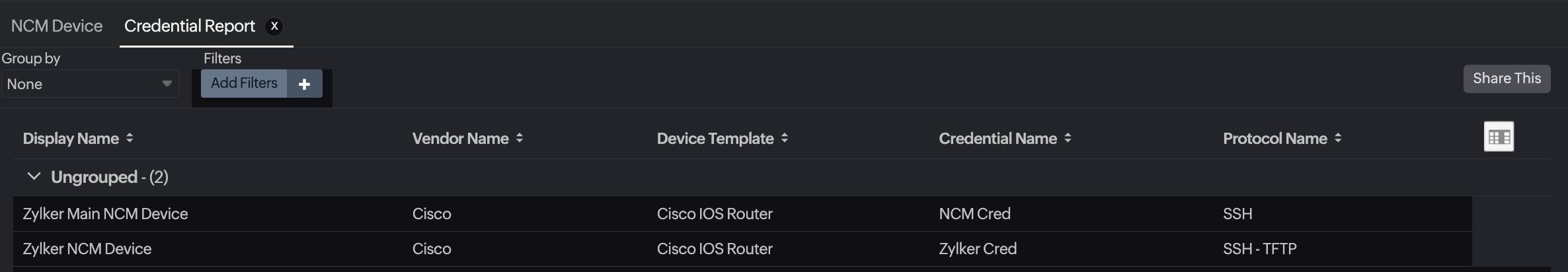 The Credential Report in Site24x7's Network Configuration Manager (NCM) provides a comprehensive overview of the credentials associated with your network devices. This report helps you validate the credential mappings and verify configuration backup readiness across devices in your network.