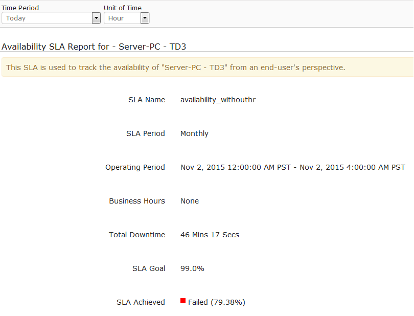 For example, assume you have defined a business hour named 'Friday' as between 08:00 to 20:00 hours. This timeframe is applicable every Friday. Now if you specify this business hour while creating new availability SLA, it means the SLA will be applicable from 08:00 to 20:00 hours on Fridays. - Total Downtime: The cumulative downtime data recorded during the operating period.