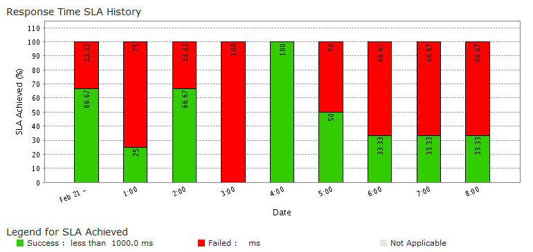 The Response Time SLA History graph depicts the percentage of SLA achieved by the monitor, for a specified unit of time during the selected operating period. The average SLA achieved by the monitor can be deducted from this graphical data. Legends are provided below the graph to help decode the various trends. By default, the threshold value for response time SLA is set at 1000ms or less. Whenever there is an overshoot, the SLA is deemed to be violated and shown in red. Any SLA achieved status is highlighted in green. Infact, each goals can be custom colored during the setup process.
