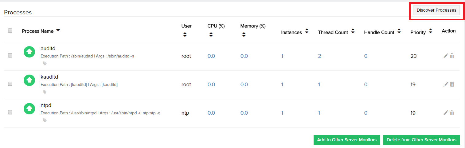 - Manual addition: Click on the Discover Services and Processes/Discover Processes button in the Services and Processes tab (Windows)/Processes tab (Linux). Select the services/processes that you wish to monitor and add them for monitoring.