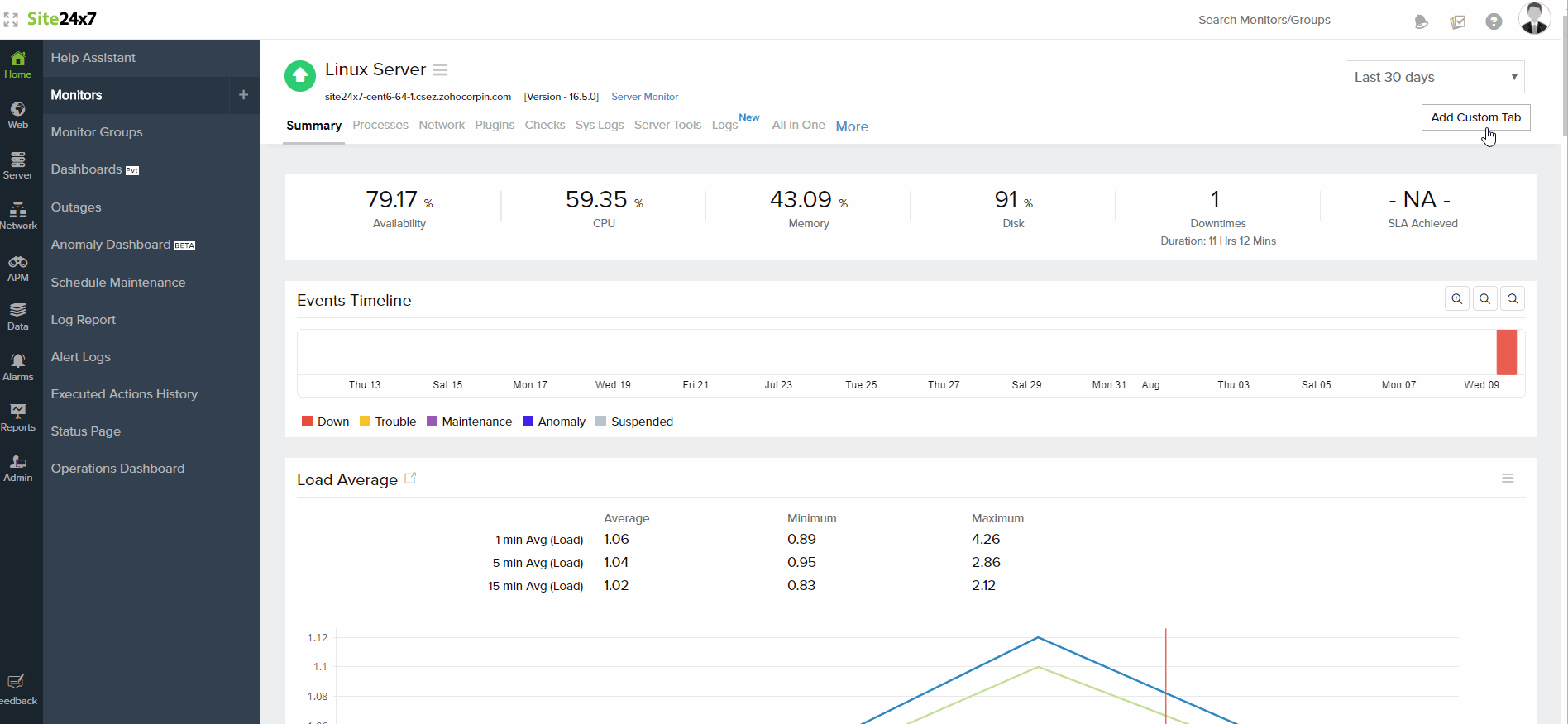 Log in to Site24x7 and go to Reports > Server Monitor to access performance reports for Linux monitoring. In addition to the common reports available for all monitor types in Site24x7, server monitoring has some exclusive reports on disk usage, network adapter details, agent inventory, and top n reports for CPU, memory, and disk. Learn more.