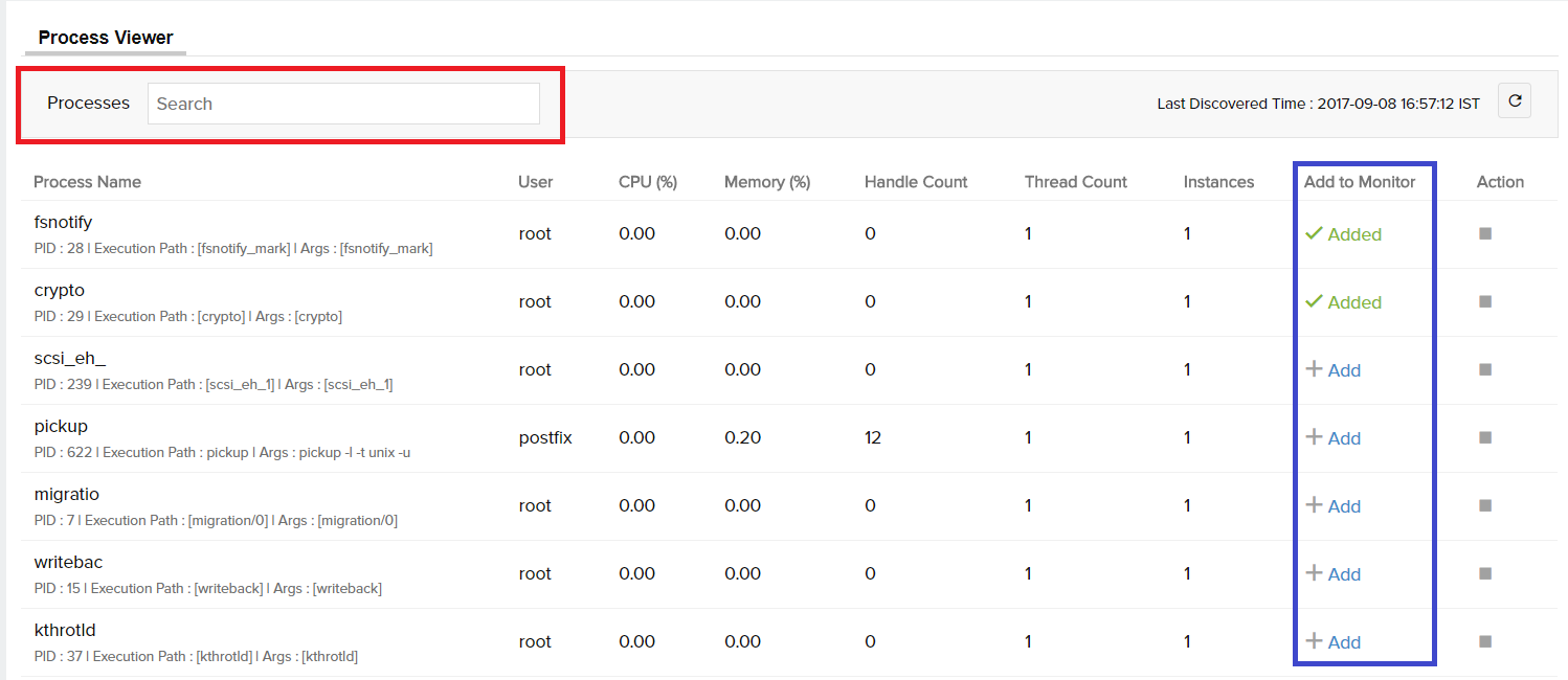 Get the complete list of all the active processes running on your Linux server with their CPU (%) usage, memory (%) usage, handle count, thread count, and instances. You can search for any particular process in the Search Bar at the top (highlighted in red in the screenshot below). You can add processes for monitoring by using the +Add option beside the process name (highlighted in blue in the screenshot below).
