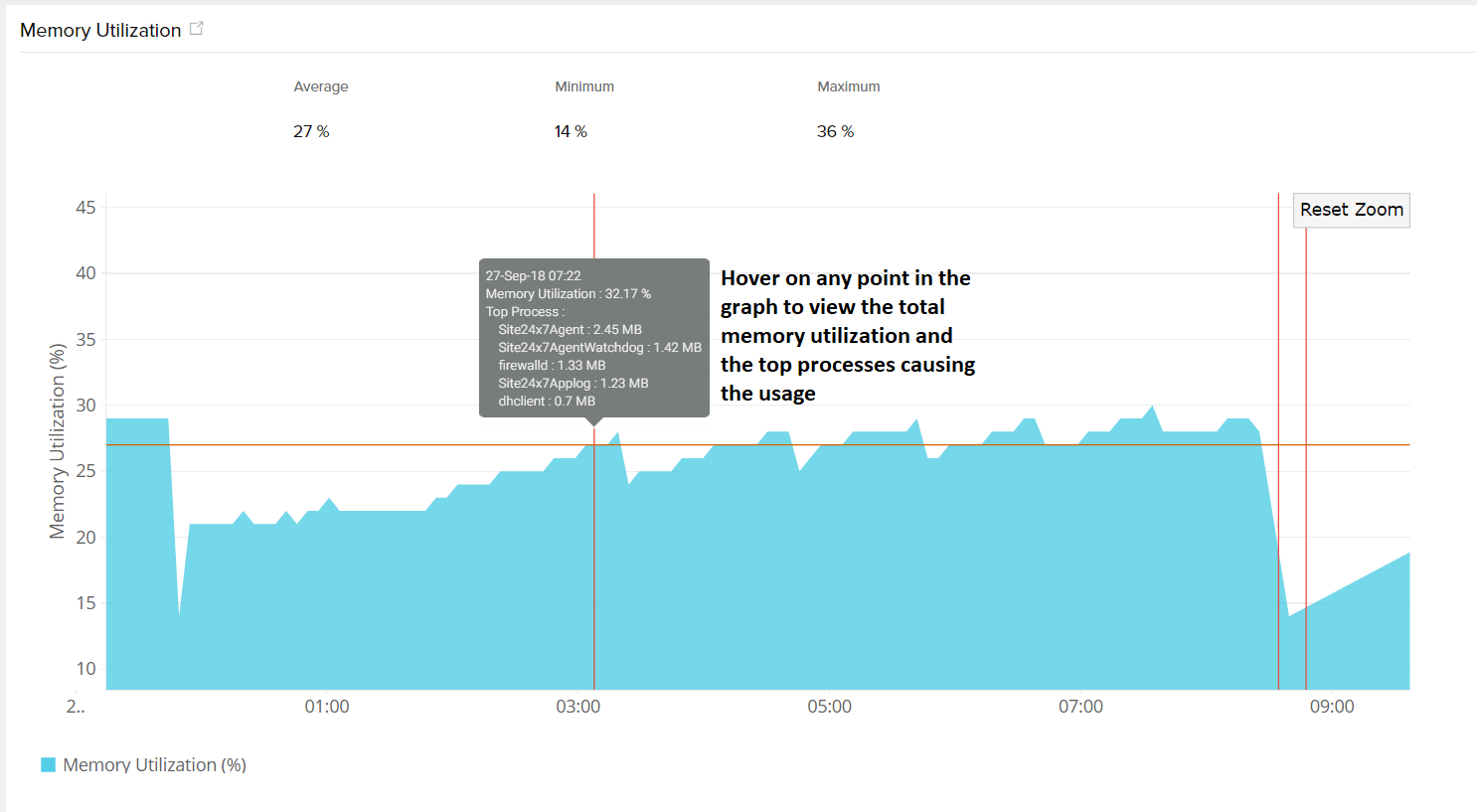Also, view the top five processes consuming memory for a particular point of time by hovering on a particular point in the Memory Utilization graph. The top process data is calculated using the Python module 'psutil'.