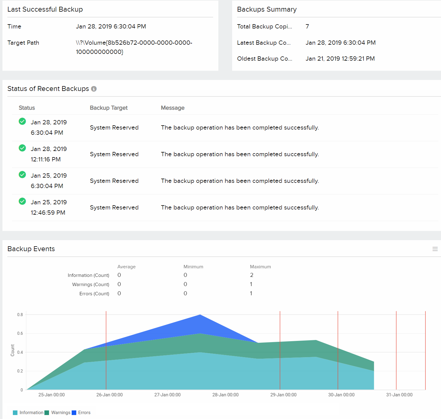 | Backup Events | A count of information, warning, and error events occurred in the backups |
